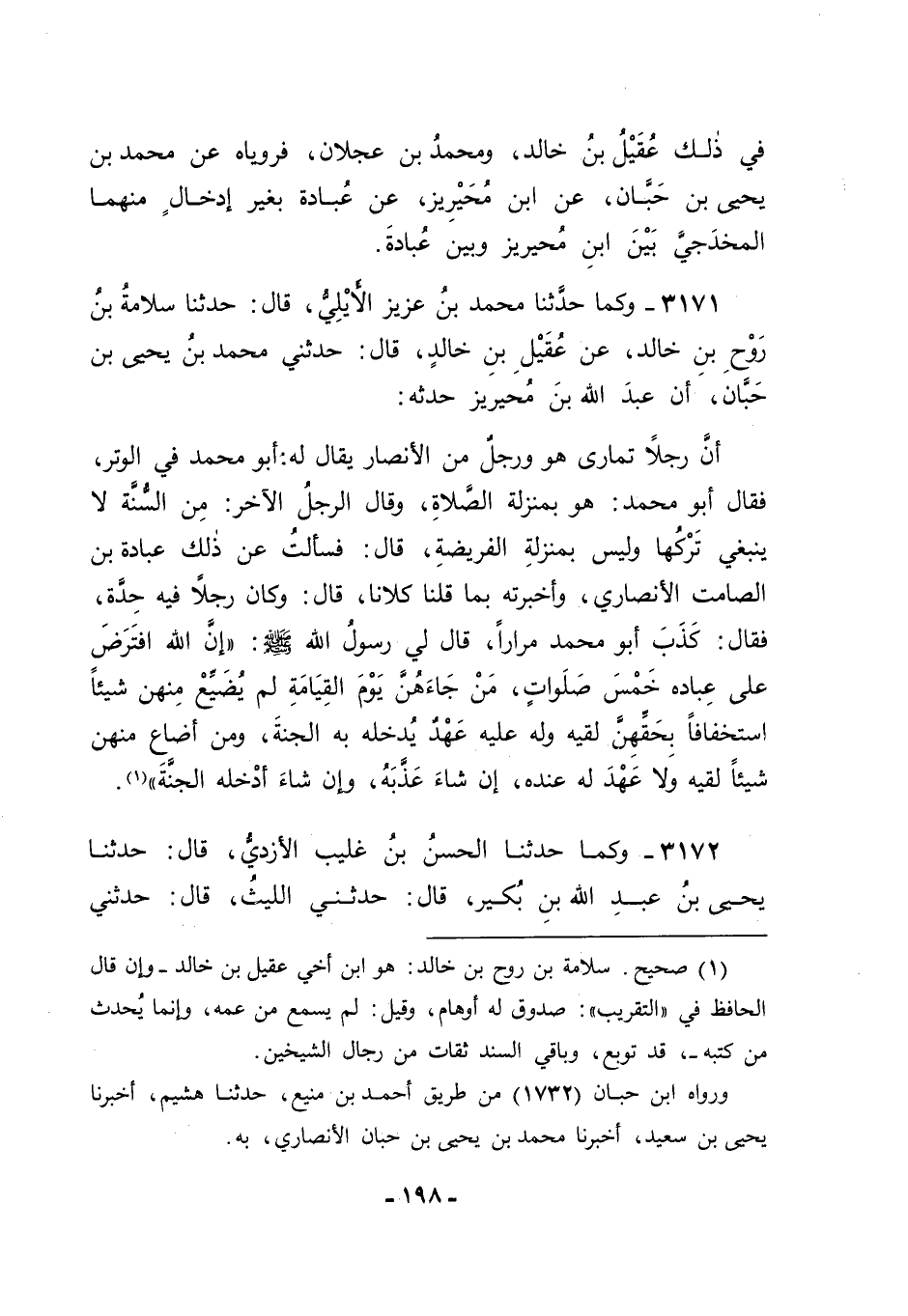 3171 - وَكَمَا حَدَّثَنَا مُحَمَّدُ بْنُ عَزِيزٍ الْأَيْلِيُّ قَالَ: حَدَّثَنَا سَلَامَةُ بْنُ رَوْحِ بْنِ خَالِدٍ، عَنْ عُقَيْلِ بْنِ خَالِدٍ قَالَ: حَدَّثَنِي مُحَمَّدُ بْنُ يَحْيَى بْنِ حِبَّانَ، أَنَّ عَبْدَ اللهِ بْنَ مُحَيْرِيزٍ، حَدَّثَهُ: أَنَّ رَجُلًا تَمَارَى هُوَ وَرَجُلٌ مِنَ الْأَنْصَارِ يُقَالُ لَهُ أَبُو مُحَمَّدٍ فِي الْوِتْرِ، فَقَالَ أَبُو مُحَمَّدٍ: " هُوَ بِمَنْزِلَةِ الصَّلَاةِ "، وَقَالَ الرَّجُلُ الْآخَرُ: " مِنَ السُّنَّةِ، لَا يَنْبَغِي تَرْكُهَا، وَلَيْسَ بِمَنْزِلَةِ الْفَرِيضَةِ ". قَالَ: فَسَأَلْتُ عَنْ ذَلِكَ عُبَادَةَ بْنَ الصَّامِتِ الْأَنْصَارِيَّ , وَأَخْبَرْتُهُ بِمَا قُلْنَا كِلَانَا، قَالَ: وَكَانَ رَجُلًا فِيهِ حِدَةٌ، فَقَالَ: " كَذَبَ أَبُو مُحَمَّدٍ، مِرَارًا، قَالَ لِي رَسُولُ اللهِ صَلَّى اللَّهُ عَلَيْهِ وَسَلَّمَ: " إنَّ اللهَ افْتَرَضَ عَلَى عِبَادِهِ خَمْسَ صَلَوَاتٍ، مَنْ جَاءَهُنَّ يَوْمَ الْقِيَامَةِ لَمْ يُضَيِّعْ مِنْهُنَّ شَيْئًا اسْتِخْفَافًا بِحَقِّهِنَّ لَقِيَهُ وَلَهُ عَلَيْهِ عَهْدٌ يُدْخِلُهُ بِهِ الْجَنَّةَ، وَمَنْ أَضَاعَ مِنْهُنَّ شَيْئًا لَقِيَهُ وَلَا عَهْدَ لَهُ عِنْدَهُ، إنْ شَاءَ عَذَّبَهُ، وَإِنْ شَاءَ أَدْخَلَهُ الْجَنَّةَ "