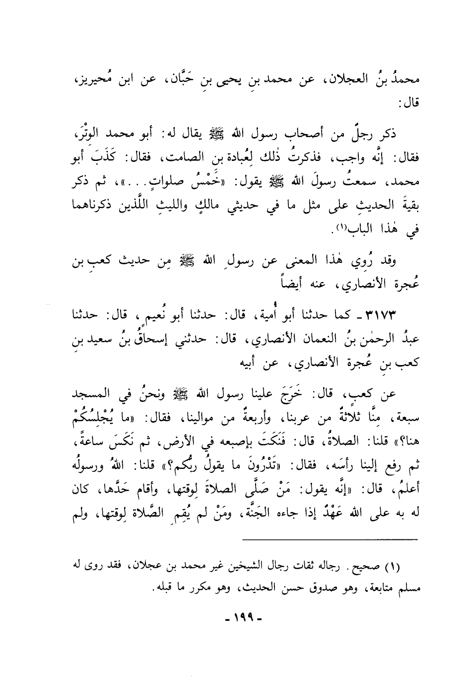 3173 - كَمَا حَدَّثَنَا أَبُو أُمَيَّةَ قَالَ: حَدَّثَنَا أَبُو نُعَيْمٍ قَالَ: حَدَّثَنَا عَبْدُ الرَّحْمَنِ بْنُ النُّعْمَانِ الْأَنْصَارِيُّ قَالَ: حَدَّثَنِي إِسْحَاقُ بْنُ سَعِيدِ بْنِ كَعْبِ بْنِ عُجْرَةَ الْأَنْصَارِيُّ، عَنْ أَبِيهِ، عَنْ كَعْبٍ قَالَ: " خَرَجَ عَلَيْنَا رَسُولُ اللهِ صَلَّى اللَّهُ عَلَيْهِ وَسَلَّمَ وَنَحْنُ فِي الْمَسْجِدِ، سَبْعَةٌ مِنَّا، ثَلَاثَةٌ مِنْ عَرَبِنَا وَأَرْبَعَةٌ مِنْ مَوَالِينَا، فَقَالَ: " مَا يُجْلِسُكُمْ هُنَا؟ "، قُلْنَا: الصَّلَاةُ، قَالَ: فَنَكَتَ بِأُصْبُعِهِ فِي الْأَرْضِ ثُمَّ نَكَسَ سَاعَةً، ثُمَّ رَفَعَ إلَيْنَا رَأْسَهُ فَقَالَ: " تَدْرُونَ مَا يَقُولُ رَبُّكُمْ؟ "، قُلْنَا: اللهُ وَرَسُولُهُ أَعْلَمُ، قَالَ: " إنَّهُ يَقُولُ: مَنْ صَلَّى الصَّلَاةَ لِوَقْتِهَا، وَأَقَامَ حَدَّهَا، كَانَ لَهُ بِهِ عَلَى اللهِ عَهْدٌ إذَا جَاءَهُ الْجَنَّةُ، وَمَنْ لَمْ يُقِمِ الصَّلَاةَ لِوَقْتِهَا، وَلَمْ -[200]- يُقِمْ حَدَّهَا، لَمْ يَكُنْ لَهُ بِهِ عِنْدِي عَهْدٌ، إنْ شِئْتُ أَدْخَلْتُهُ النَّارَ، وَإِنْ شِئْتُ أَدْخَلْتُهُ الْجَنَّةَ ".