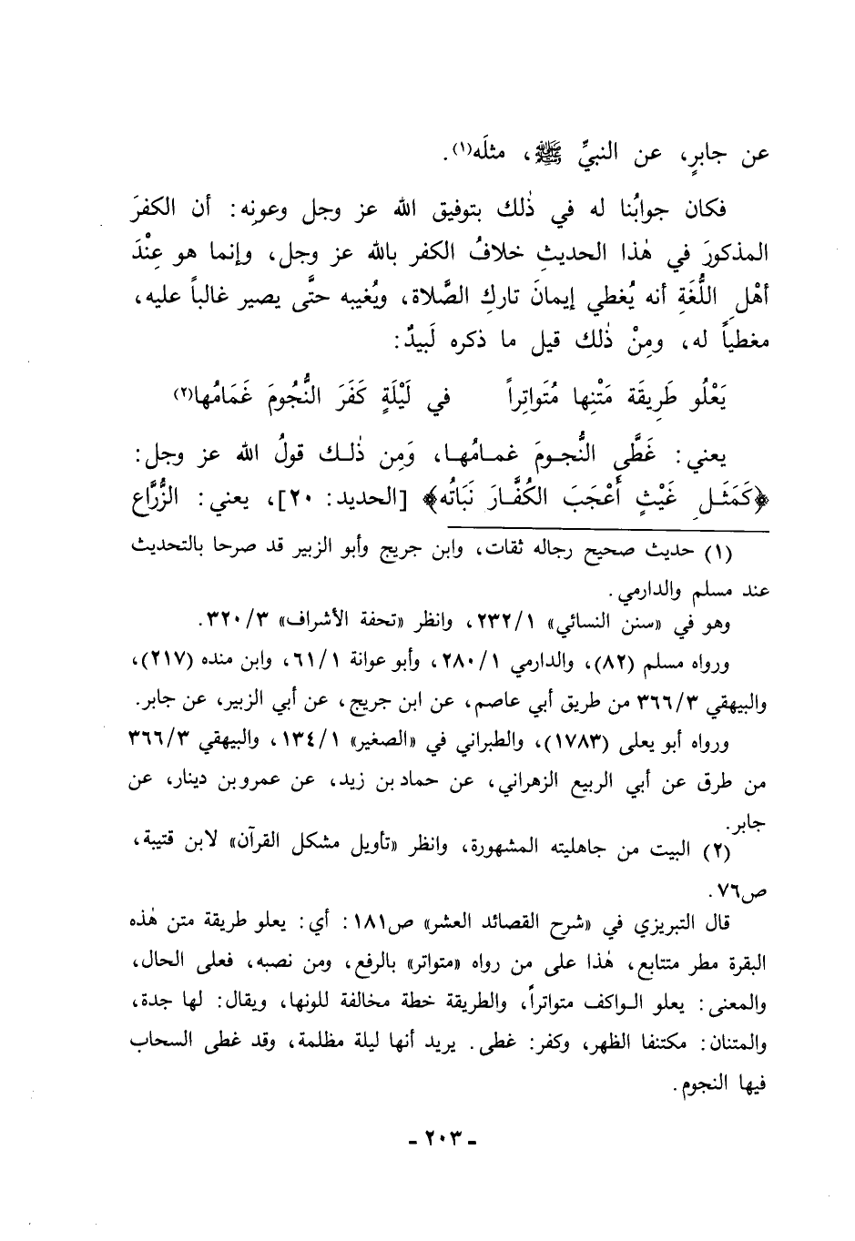 3178 - وَكَمَا حَدَّثَنَا أَحْمَدُ بْنُ شُعَيْبٍ قَالَ: حَدَّثَنَا أَحْمَدُ بْنُ حَرْبٍ قَالَ: حَدَّثَنَا مُحَمَّدُ بْنُ رَبِيعَةَ، عَنِ ابْنِ جُرَيْجٍ، عَنْ أَبِي الزُّبَيْرِ، عَنْ جَابِرٍ، عَنِ النَّبِيِّ صَلَّى اللَّهُ عَلَيْهِ وَسَلَّمَ مِثْلَهُ. فَكَانَ جَوَابُنَا لَهُ فِي ذَلِكَ بِتَوْفِيقِ اللهِ عَزَّ وَجَلَّ وَعَوْنِهِ: أَنَّ الْكُفْرَ الْمَذْكُورَ فِي هَذَا الْحَدِيثِ خِلَافُ الْكُفْرِ بِاللهِ عَزَّ وَجَلَّ، وَإِنَّمَا هُوَ عِنْدَ أَهْلِ اللُّغَةِ أَنَّهُ يُغَطِّي إيمَانَ تَارِكِ الصَّلَاةِ وَيُغَيِّبُهُ حَتَّى يَصِيرَ غَالِبًا عَلَيْهِ، مُغَطِّيًا لَهُ، وَمِنْ ذَلِكَ قِيلَ مَا ذَكَرَهُ لَبِيدٌ: