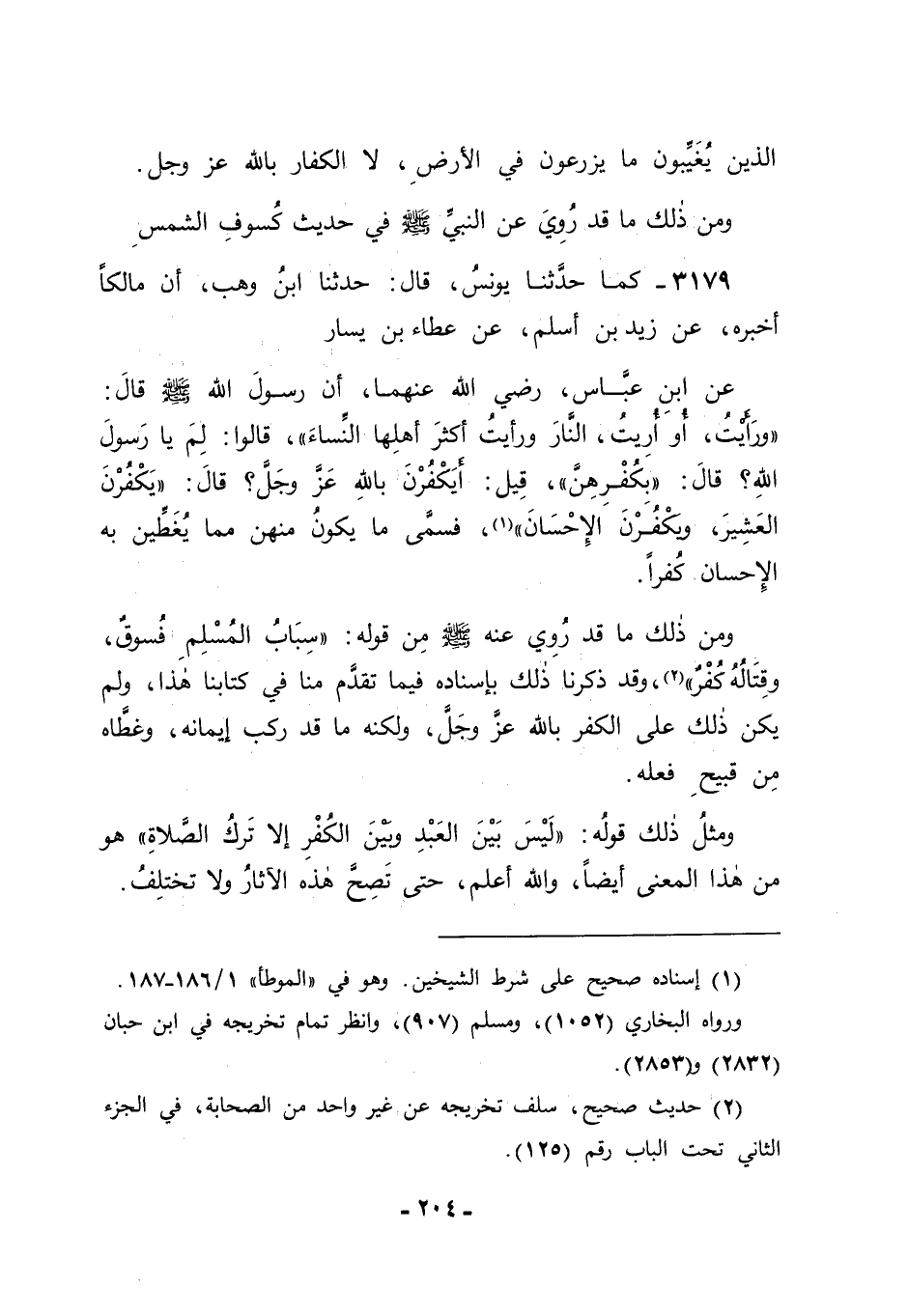 3179 - كَمَا حَدَّثَنَا يُونُسُ قَالَ: حَدَّثَنَا ابْنُ وَهْبٍ، أَنَّ مَالِكًا أَخْبَرَهُ، عَنْ زَيْدِ بْنِ أَسْلَمَ، عَنْ عَطَاءِ بْنِ يَسَارٍ، عَنِ ابْنِ عَبَّاسٍ رَضِيَ اللهُ عَنْهُمَا أَنَّ رَسُولَ اللهِ صَلَّى اللَّهُ عَلَيْهِ وَسَلَّمَ قَالَ: " وَرَأَيْتُ، أَوْ أُرِيتُ النَّارَ، وَرَأَيْتُ أَكْثَرَ أَهْلِهَا النِّسَاءَ "، قَالُوا: لِمَ يَا رَسُولَ اللهِ؟، قَالَ: " بِكُفْرِهِنَّ "، قِيلَ: أَيَكْفُرْنَ بِاللهِ عَزَّ وَجَلَّ؟، قَالَ: " يَكْفُرْنَ الْعَشِيرَ، وَيَكْفُرْنَ الْإِحْسَانَ ". فَسَمَّى مَا يَكُونُ مِنْهُنَّ مِمَّا يُغَطِّينَ بِهِ الْإِحْسَانَ كُفْرًا. وَمِنْ ذَلِكَ مَا قَدْ رُوِيَ عَنْهُ صَلَّى اللَّهُ عَلَيْهِ وَسَلَّمَ مِنْ قَوْلِهِ: " سِبَابُ الْمُسْلِمِ فُسُوقٌ، وَقِتَالُهُ كُفْرٌ ". وَقَدْ ذَكَرْنَا ذَلِكَ بِإِسْنَادِهِ فِيمَا تَقَدَّمَ مِنَّا فِي كِتَابِنَا هَذَا , وَلَمْ يَكُنْ ذَلِكَ عَلَى الْكُفْرِ بِاللهِ عَزَّ وَجَلَّ، وَلَكِنَّهُ مَا قَدْ رَكِبَ إيمَانَهُ وَغَطَّاهُ مِنْ قَبِيحِ فِعْلِهِ. وَمِثْلُ ذَلِكَ قَوْلُهُ: " لَيْسَ بَيْنَ الْعَبْدِ وَبَيْنَ الْكُفْرِ إِلَّا تَرْكُ الصَّلَاةِ " هُوَ مِنْ هَذَا الْمَعْنَى أَيْضًا، وَاللهُ أَعْلَمُ، حَتَّى تَصِحَّ هَذِهِ الْآثَارُ، وَلَا تَخْتَلِفَ. -[205]- وَقَدِ اخْتَلَفَ أَهْلُ الْعِلْمِ فِي تَارِكِ الصَّلَاةِ كَمَا ذَكَرْنَا، فَجَعَلَهُ بَعْضُهُمْ بِذَلِكَ مُرْتَدًّا عَنِ الْإِسْلَامِ، وَجَعَلَ حُكْمَهُ حُكْمَ مَنْ يُسْتَتَابُ مِنْ ذَلِكَ، فَإِنْ تَابَ وَإِلَّا قُتِلَ، مِنْهُمُ الشَّافِعِيُّ، وَمِنْهُمْ مَنْ لَمْ يَجْعَلْهُ بِذَلِكَ مُرْتَدًّا، وَجَعَلَهُ مِنْ فَاسِقِي الْمُسْلِمِينَ وَأَهْلِ الْكَبَائِرِ مِنْهُمْ، وَمِمَّنْ قَالَ بِذَلِكَ أَبُو حَنِيفَةَ رَحِمَهُ اللهُ، وَأَصْحَابُهُ، وَكَانَ هَذَا الْقَوْلُ أَوْلَى عِنْدَنَا بِالْقِيَاسِ ; لِأَنَّا قَدْ وَجَدْنَا لِلَّهِ عَزَّ وَجَلَّ فَرَائِضَ عَلَى عِبَادِهِ فِي أَوْقَاتٍ خَوَاصٍّ، مِنْهَا الصَّلَوَاتُ الْخَمْسُ، وَمِنْهَا صِيَامُ شَهْرِ رَمَضَانَ، وَكَانَ مَنْ تَرَكَ صَوْمَ شَهْرِ رَمَضَانَ مُتَعَمِّدًا بِغَيْرِ جَحْدٍ لِفَرْضِهِ عَلَيْهِ لَا يَكُونُ بِذَلِكَ كَافِرًا، وَلَا عَنِ الْإِسْلَامِ مُرْتَدًّا، فَكَانَ مِثْلَهُ تَارِكُ الصَّلَاةِ حَتَّى يَخْرُجَ وَقْتُهَا، لَا عَلَى الْجُحُودِ بِهَا، وَلَا عَلَى كُفْرٍ بِهَا، لَا يَكُونُ بِذَلِكَ مُرْتَدًّا، وَلَا عَنِ الْإِسْلَامِ خَارِجًا، وَالدَّلِيلُ عَلَى ذَلِكَ أَنَّا نَأْمُرُهُ أَنْ يُصَلِّيَ وَلَا نَأْمُرُ كَافِرًا بِالصَّلَاةِ، -[206]- وَلَوْ كَانَ بِمَا كَانَ مِنْهُ كَافِرًا لَأَمَرْنَاهُ بِالْإِسْلَامِ، فَإِذَا أَسْلَمَ أَمَرْنَاهُ بِالصَّلَاةِ، وَفِي تَرْكِنَا لِذَلِكَ وَأَمْرِنَا إيَّاهُ بِالصَّلَاةِ مَا قَدْ دَلَّ عَلَى أَنَّهُ مِنْ أَهْلِ الصَّلَاةِ، وَمِنْ ذَلِكَ أَمْرُ النَّبِيِّ صَلَّى اللَّهُ عَلَيْهِ وَسَلَّمَ الَّذِي أَفْطَرَ فِي يَوْمٍ مِنْ شَهْرِ رَمَضَانَ مُتَعَمِّدًا بِالْكَفَّارَةِ الَّتِي أَمَرَهُ بِهَا فِيهِ، وَفِيهَا الصِّيَامُ، وَلَا يَكُونُ الصِّيَامُ إِلَّا مِنَ الْمُسْلِمِينَ، وَلَمَّا كَانَ الرَّجُلُ يَكُونُ مُسْلِمًا إذَا أَقَرَّ بِالْإِسْلَامِ قَبْلَ أَنْ يَأْتِيَ بِمَا يُوجِبُهُ عَلَيْهِ الْإِسْلَامُ مِنَ الصَّلَوَاتِ الْخَمْسِ، وَمِنْ صِيَامِ رَمَضَانَ، كَانَ كَذَلِكَ يَكُونُ كَافِرًا بِجُحُودِهِ لِذَلِكَ، وَلَا يَكُونُ كَافِرًا بِتَرْكِهِ إيَّاهُ بِغَيْرِ جُحُودٍ مِنْهُ لَهُ، وَلَا يَكُونُ كَافِرًا إِلَّا مِنْ حَيْثُ كَانَ مُسْلِمًا , وَإِسْلَامُهُ كَانَ بِإِقْرَارِهِ بِالْإِسْلَامِ، وَكَذَلِكَ رِدَّتُهُ لَا تَكُونُ إِلَّا بِجُحُودِهِ الْإِسْلَامَ، وَالله