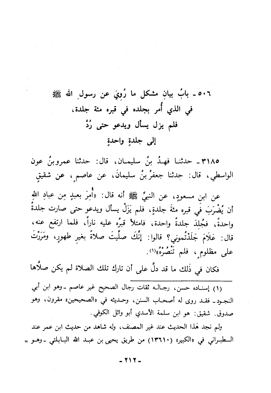 3185 - حَدَّثَنَا فَهْدُ بْنُ سُلَيْمَانَ قَالَ: حَدَّثَنَا عَمْرُو بْنُ عَوْنٍ الْوَاسِطِيُّ قَالَ: حَدَّثَنَا جَعْفَرُ بْنُ سُلَيْمَانَ، عَنْ عَاصِمٍ، عَنْ شَقِيقٍ، عَنِ ابْنِ مَسْعُودٍ، عَنِ النَّبِيِّ صَلَّى اللَّهُ عَلَيْهِ وَسَلَّمَ أَنَّهُ قَالَ: " أُمِرَ بِعَبْدٍ مِنْ عِبَادِ اللهِ أَنْ يُضْرَبَ فِي قَبْرِهِ مِائَةَ جَلْدَةٍ، فَلَمْ يَزَلْ يَسْأَلُ وَيَدْعُو حَتَّى صَارَتْ جَلْدَةً وَاحِدَةً، فَجُلِدَ جَلْدَةً وَاحِدَةً، فَامْتَلَأَ قَبْرُهُ عَلَيْهِ نَارًا، فَلَمَّا ارْتَفَعَ عَنْهُ قَالَ: عَلَامَ جَلَدْتُمُونِي؟، قَالُوا: إِنَّكَ صَلَّيْتَ صَلَاةً بِغَيْرِ طُهُورٍ , وَمَرَرْتَ عَلَى مَظْلُومٍ فَلَمْ تَنْصُرْهُ ". فَكَانَ فِي ذَلِكَ مَا قَدْ دَلَّ عَلَى أَنَّ تَارِكَ تِلْكَ الصَّلَاةِ لَمْ يَكُنْ صَلَّاهَا -[213]- حَتَّى خَرَجَ وَقْتُهَا، وَفِي إجَابَةِ اللهِ عَزَّ وَجَلَّ دُعَاءَهُ , مَا قَدْ دَلَّ أَنَّهُ لَمْ يَكُنْ بِذَلِكَ كَافِرًا ; لِأَنَّهُ لَوْ كَانَ كَافِرًا كَانَ دُعَاؤُهُ دَاخِلًا فِي قَوْلِ اللهِ عَزَّ وَجَلَّ: {وَمَا دُعَاءُ الْكَافِرِينَ إِلَّا فِي ضَلَالٍ} [الرعد: 14] . وَاللهَ نَسْأَلُهُ التَّوْفِيقَ.