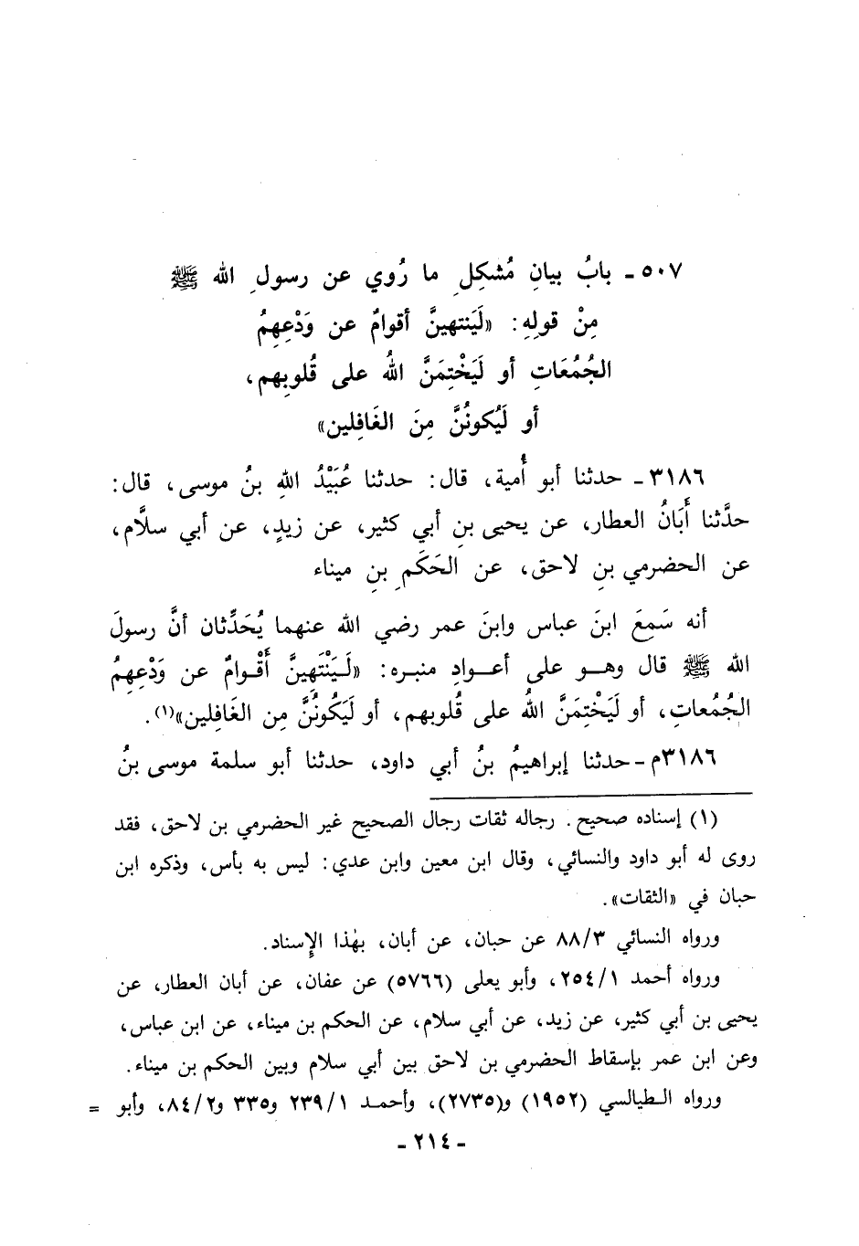 3186 - حَدَّثَنَا أَبُو أُمَيَّةَ قَالَ: حَدَّثَنَا عُبَيْدُ اللهِ بْنُ مُوسَى قَالَ: حَدَّثَنَا أَبَانُ الْعَطَّارُ، عَنْ يَحْيَى بْنِ أَبِي كَثِيرٍ، عَنْ زَيْدٍ، عَنْ أَبِي سَلَّامٍ، عَنِ الْحَضْرَمِيِّ بْنِ لَاحِقٍ، عَنِ الْحَكَمِ بْنِ مِينَاءَ: أَنَّهُ سَمِعَ ابْنَ عَبَّاسٍ، وَابْنَ عُمَرَ رَضِيَ اللهُ عَنْهُمَا يُحَدِّثَانِ: أَنَّ رَسُولَ اللهِ صَلَّى اللَّهُ عَلَيْهِ وَسَلَّمَ قَالَ وَهُوَ عَلَى أَعْوَادِ مِنْبَرِهِ: " لَيَنْتَهِيَنَّ أَقْوَامٌ عَنْ وَدْعِهِمُ الْجُمُعَاتِ، أَوْ لَيَخْتِمَنَّ اللهُ عَلَى قُلُوبِهِمْ، أَوْ لَيَكُونُنَّ مِنَ الْغَافِلِينَ ".