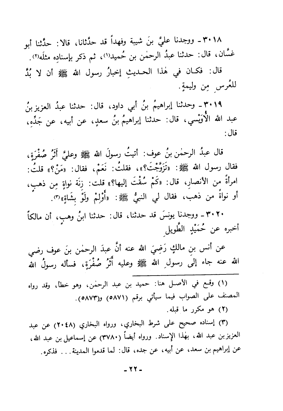 3019 - وَحَدَّثَنَا إبْرَاهِيمُ بْنُ أَبِي دَاوُدَ قَالَ: حَدَّثَنَا عَبْدُ الْعَزِيزِ بْنُ عَبْدِ اللهِ الْأُوَيْسِيُّ قَالَ: حَدَّثَنَا إبْرَاهِيمُ بْنُ سَعْدٍ، عَنْ أَبِيهِ، عَنْ جَدِّهِ قَالَ: قَالَ عَبْدُ الرَّحْمَنِ بْنُ عَوْفٍ: " أَتَيْتُ رَسُولَ اللهِ صَلَّى اللَّهُ عَلَيْهِ وَسَلَّمَ وَعَلَيَّ أَثَرُ صُفْرَةٍ , فَقَالَ رَسُولُ اللهِ صَلَّى اللَّهُ عَلَيْهِ وَسَلَّمَ: " تَزَوَّجْتَ؟ " فَقُلْتُ: نَعَمْ، فَقَالَ: " مَنْ؟ ". قُلْتُ: امْرَأَةً مِنَ الْأَنْصَارِ، قَالَ: " كَمْ سُقْتَ إلَيْهَا؟ " قُلْتُ: زِنَةَ نَوَاةٍ مِنْ ذَهَبٍ، أَوْ نَوَاةِ ذَهَبٍ، فَقَالَ لِي النَّبِيُّ صَلَّى اللَّهُ عَلَيْهِ وَسَلَّمَ: " أَوْلِمْ وَلَوْ بِشَاةٍ "