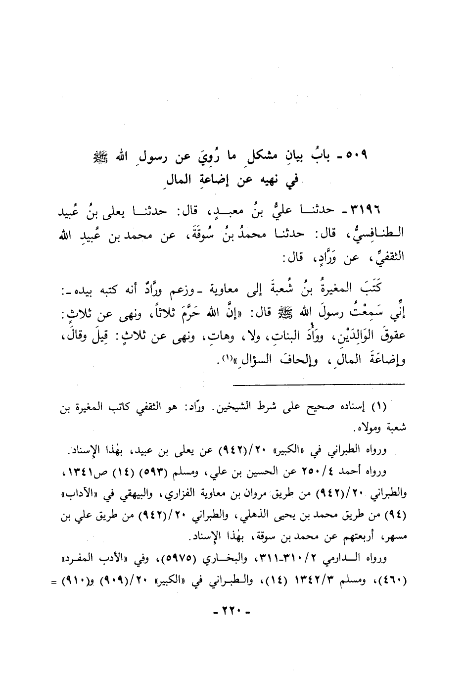 3196 - حَدَّثَنَا عَلِيُّ بْنُ مَعْبَدٍ قَالَ: حَدَّثَنَا يَعْلَى بْنُ عُبَيْدٍ الطَّنَافِسِيُّ قَالَ: حَدَّثَنَا مُحَمَّدُ بْنُ سُوقَةَ، عَنْ مُحَمَّدِ بْنِ عُبَيْدِ اللهِ الثَّقَفِيِّ، عَنْ وَرَّادٍ قَالَ: كَتَبَ الْمُغِيرَةُ بْنُ شُعْبَةَ إلَى مُعَاوِيَةَ، وَزَعَمَ وَرَّادٌ أَنَّهُ كَتَبَهُ بِيَدِهِ: إنِّي سَمِعْتُ رَسُولَ اللهِ صَلَّى اللَّهُ عَلَيْهِ وَسَلَّمَ قَالَ: " إنَّ اللهَ حَرَّمَ ثَلَاثًا، وَنَهَى عَنْ ثَلَاثٍ: عُقُوقَ الْوَالِدَيْنِ، وَوَأْدَ الْبَنَاتِ، وَلَا , وَهَاتِ، وَنَهَى عَنْ ثَلَاثٍ: قِيلَ وَقَالَ، وَإِضَاعَةِ الْمَالِ، وَإِلْحَافِ السُّؤَالِ "