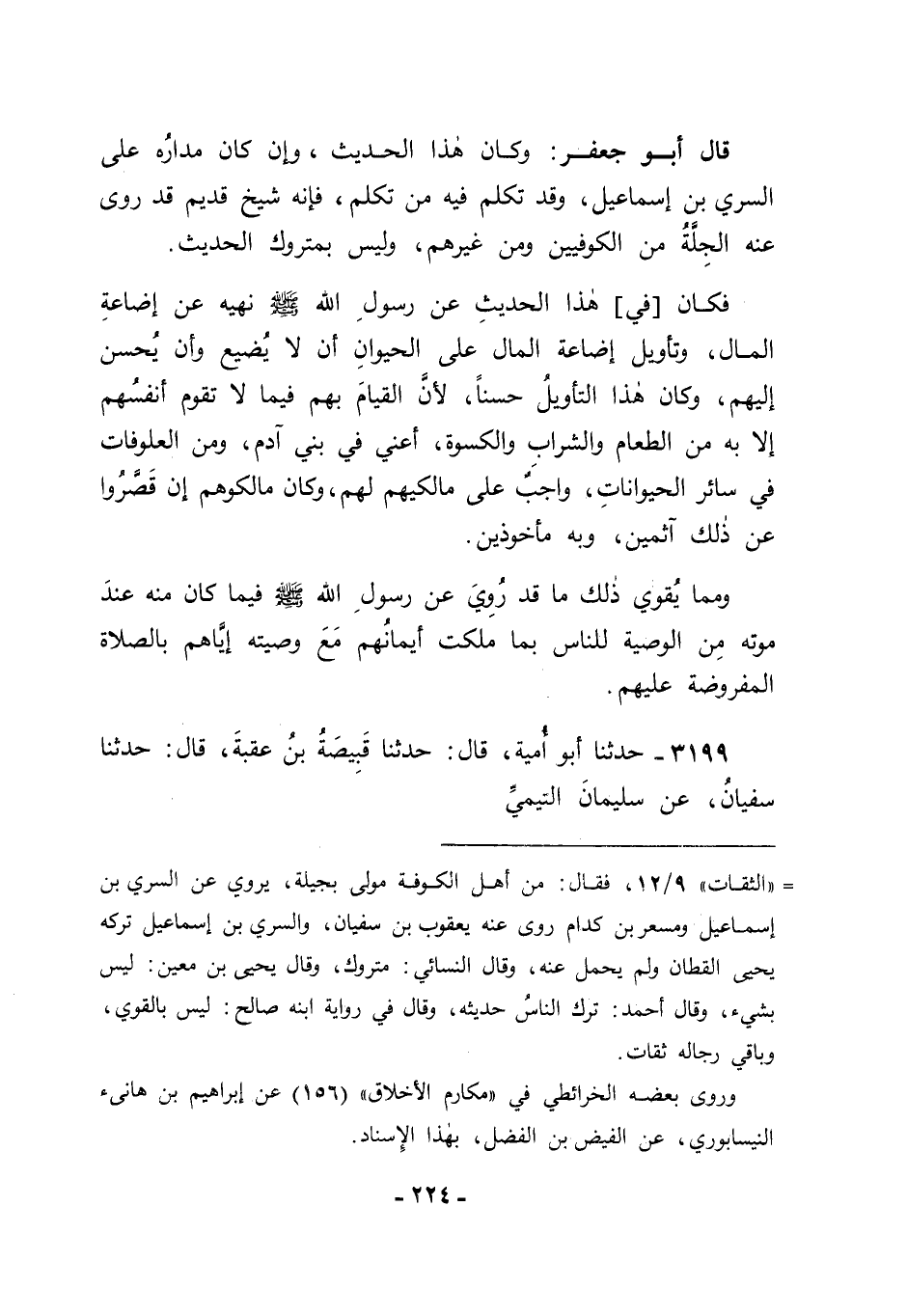 3199 - حَدَّثَنَا أَبُو أُمَيَّةَ قَالَ: حَدَّثَنَا قَبِيصَةُ بْنُ عُقْبَةَ قَالَ: حَدَّثَنَا سُفْيَانُ، عَنْ سُلَيْمَانَ التَّيْمِيِّ، -[225]- عَنْ: أَنَسٍ قَالَ: " أَوْصَى رَسُولُ اللهِ صَلَّى اللَّهُ عَلَيْهِ وَسَلَّمَ وَلِسَانُهُ لَا يَكَادُ، فَذَكَرَ كَلِمَةً فَقَالَ: " الصَّلَاةَ، وَمَا مَلَكَتْ أَيْمَانُكُمْ "
