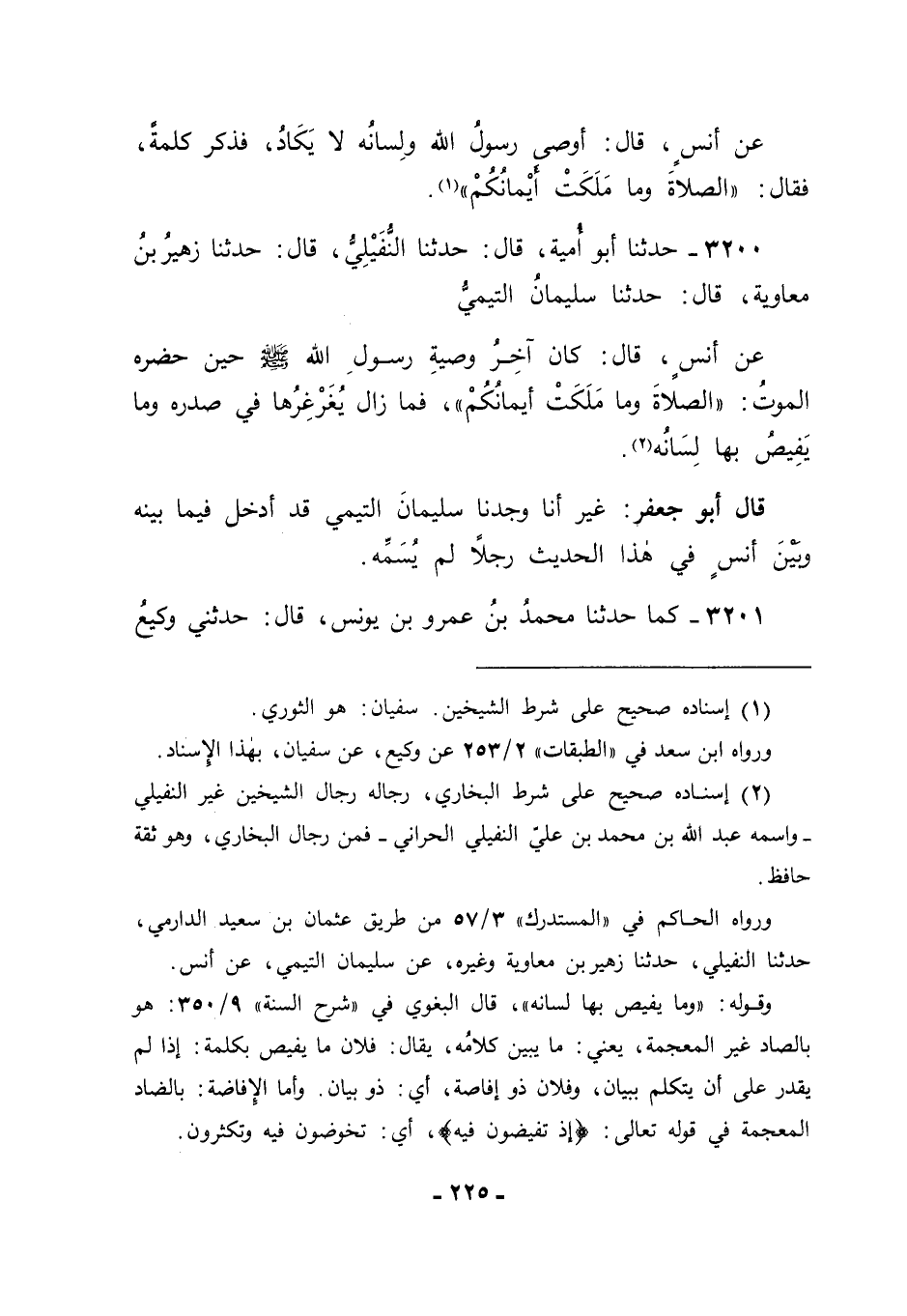 3200 - حَدَّثَنَا أَبُو أُمَيَّةَ قَالَ: حَدَّثَنَا النُّفَيْلِيُّ قَالَ: حَدَّثَنَا زُهَيْرُ بْنُ مُعَاوِيَةَ قَالَ: حَدَّثَنَا سُلَيْمَانُ التَّيْمِيُّ، عَنْ أَنَسٍ قَالَ: " كَانَ آخِرُ وَصِيَّةِ رَسُولِ اللهِ صَلَّى اللَّهُ عَلَيْهِ وَسَلَّمَ حِينَ حَضَرَهُ الْمَوْتُ: " الصَّلَاةَ، وَمَا مَلَكَتْ أَيْمَانُكُمْ "، فَمَا زَالَ يُغَرْغِرُهَا فِي صَدْرِهِ، وَمَا يُفِيضُ بِهَا لِسَانُهُ ". قَالَ أَبُو جَعْفَرٍ: غَيْرَ أَنَّا وَجَدْنَا سُلَيْمَانَ التَّيْمِيَّ قَدْ أَدْخَلَ فِيمَا بَيْنَهُ وَبَيْنَ أَنَسٍ فِي هَذَا الْحَدِيثِ رَجُلًا لَمْ يُسَمِّهِ