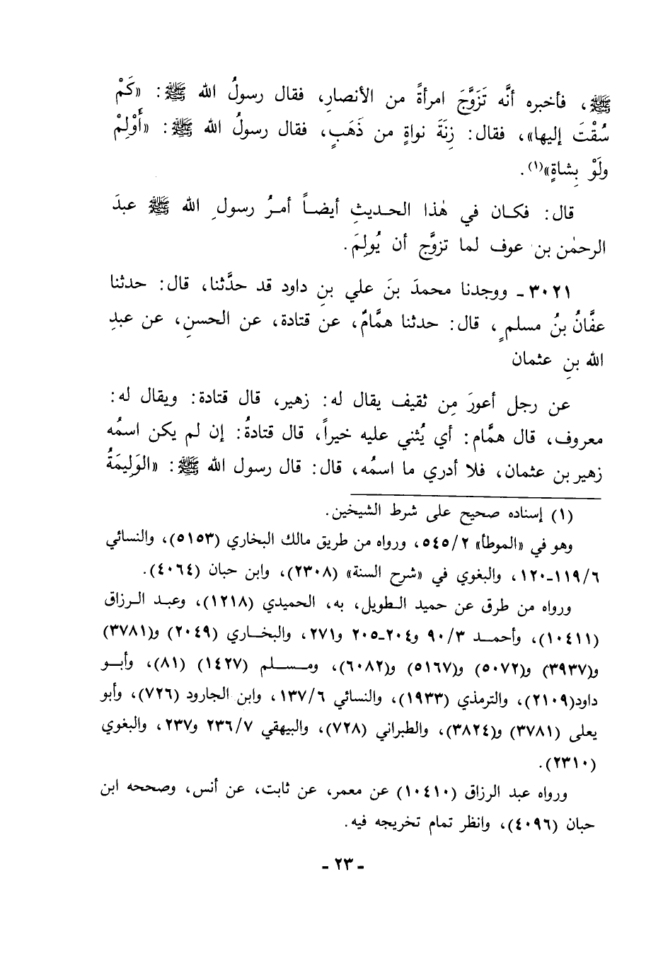 3021 - وَوَجَدْنَا مُحَمَّدَ بْنَ عَلِيِّ بْنِ دَاوُدَ قَدْ حَدَّثَنَا قَالَ: حَدَّثَنَا عَفَّانُ بْنُ مُسْلِمٍ قَالَ: حَدَّثَنَا هَمَّامٌ، عَنْ قَتَادَةَ، عَنِ الْحَسَنِ، عَنْ عَبْدِ اللهِ بْنِ عُثْمَانَ، عَنْ رَجُلٍ أَعْوَرَ مِنْ ثَقِيفٍ يُقَالُ لَهُ زُهَيْرٌ. قَالَ قَتَادَةُ: وَيُقَالُ لَهُ مَعْرُوفٌ، قَالَ هَمَّامٌ: أَيْ يُثْنِي عَلَيْهِ خَيْرًا، قَالَ قَتَادَةُ: إنْ لَمْ يَكُنِ اسْمُهُ زُهَيْرَ بْنَ عُثْمَانَ فَلَا أَدْرِي مَا اسْمُهُ، قَالَ: قَالَ رَسُولُ اللهِ صَلَّى اللَّهُ عَلَيْهِ وَسَلَّمَ: " الْوَلِيمَةُ -[24]- حَقٌّ، وَالثَّانِي مَعْرُوفٌ، وَالثَّالِثُ رِيَاءٌ وَسُمْعَةٌ ". قَالَ أَبُو جَعْفَرٍ: فَكَانَ فِي هَذَا الْحَدِيثِ إخْبَارُ رَسُولِ اللهِ صَلَّى اللَّهُ عَلَيْهِ وَسَلَّمَ أَنَّ الْوَلِيمَةَ حَقٌّ، وَفَرَّقَ بَيْنَ حُكْمِهَا فِي الْأَيَّامِ الثَّلَاثَةِ، فَجَعَلَهَا فِي أَوَّلِ يَوْمٍ مَحْمُودًا عَلَيْهَا أَهْلُهَا ; لِأَنَّهُمْ فَعَلُوا حَقًّا، وَجَعَلَهَا فِي الْيَوْمِ الثَّانِي مَعْرُوفًا ; لِأَنَّهُ قَدْ يَصِلُ إلَيْهَا فِي الْيَوْمِ الثَّانِي مَنْ عَسَى أَنْ لَا يَكُونَ وَصَلَ إلَيْهَا فِي الْيَوْمِ الْأَوَّلِ مِمَّنْ فِي وَصْلِهِ إلَيْهَا مِنَ الثَّوَابِ لِأَهْلِهَا مَا لَهُمْ فِي ذَلِكَ، وَجَعَلَهَا فِي الْيَوْمِ الثَّالِثِ بِخِلَافِ ذَلِكَ ; لِأَنَّهُ جَعَلَهَا رِيَاءً وَسُمْعَةً ; وَكَانَ مَعْلُومًا أَنَّ مَنْ دُعِيَ إلَى الْحَقِّ فَعَلَيْهِ أَنْ يُجِيبَ إلَيْهِ , وَأَنَّ مَنْ دُعِيَ إلَى الْمَعْرُوفِ فَلَهُ أَنْ يُجِيبَ إلَيْهِ وَلَيْسَ عَلَيْهِ أَنْ يُجِيبَ إلَيْهِ , وَأَنَّ مَنْ دُعِيَ إلَى الرِّيَاءِ وَالسُّمْعَةِ فَعَلَيْهِ أَنْ لَا يُجِيبَ إلَيْهِ. وَفِي ذَلِكَ مَا قَدْ دَلَّ عَلَى أَنَّ مِنَ الْأَطْعِمَةِ الَّتِي يُدْعَى إلَيْهَا مَا -[25]- لِلْمَدْعُوِّ إلَيْهِ أَنْ لَا يَأْتِيَهُ , وَإِنَّ مِنْهَا مَا عَلَى الْمَدْعُوِّ إلَيْهِ أَنْ يَأْتِيَهُ