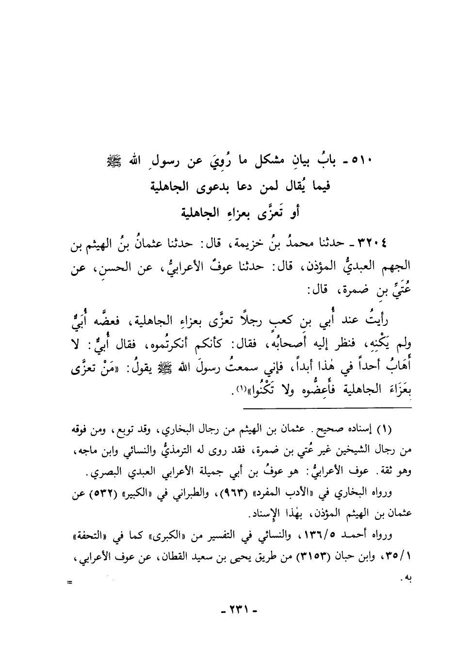 3204 - حَدَّثَنَا مُحَمَّدُ بْنُ خُزَيْمَةَ قَالَ: حَدَّثَنَا عُثْمَانُ بْنُ الْهَيْثَمِ بْنِ الْجَهْمِ الْعَبْدِيُّ الْمُؤَذِّنُ قَالَ: حَدَّثَنَا عَوْفٌ الْأَعْرَابِيُّ، عَنِ الْحَسَنِ، عَنْ عُتَيِّ بْنِ ضَمْرَةَ قَالَ: رَأَيْتُ عِنْدَ أُبَيِّ بْنِ كَعْبٍ رَجُلًا تَعَزَّى بِعَزَاءِ الْجَاهِلِيَّةِ، فَعَضَّهُ أُبَيٌّ وَلَمْ يُكَنِّهِ، فَنَظَرَ إلَيْهِ أَصْحَابُهُ، فَقَالَ: " كَأَنَّكُمْ أَنْكَرْتُمُوهُ؟ "، فَقَالَ أُبَيٌّ: " لَا أَهَابُ أَحَدًا فِي هَذَا أَبَدًا، فَإِنِّي سَمِعْتُ رَسُولَ اللهِ صَلَّى اللَّهُ عَلَيْهِ وَسَلَّمَ يَقُولُ: " مَنْ تَعَزَّى بِعَزَاءِ الْجَاهِلِيَّةِ فَأَعِضُّوهُ وَلَا تَكْنُوا "