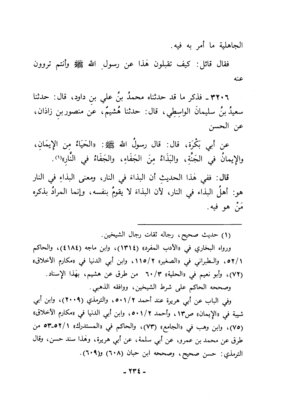 3206 - فَذَكَرَ مَا قَدْ حَدَّثَنَاهُ مُحَمَّدُ بْنُ عَلِيِّ بْنِ دَاوُدَ قَالَ: حَدَّثَنَا سَعِيدُ بْنُ سُلَيْمَانَ الْوَاسِطِيُّ قَالَ: حَدَّثَنَا هُشَيْمٌ، عَنْ مَنْصُورِ بْنِ زَاذَانَ، عَنِ الْحَسَنِ، عَنْ أَبِي بَكْرَةَ قَالَ: قَالَ رَسُولُ اللهِ صَلَّى اللَّهُ عَلَيْهِ وَسَلَّمَ: " الْحَيَاءُ مِنَ الْإِيمَانِ، وَالْإِيمَانُ فِي الْجَنَّةِ، وَالْبَذَاءُ مِنَ الْجَفَاءِ، وَالْجَفَاءُ فِي النَّارِ ". قَالَ فَفِي هَذَا الْحَدِيثِ أَنَّ الْبَذَاءَ فِي النَّارِ , وَمَعْنَى الْبَذَاءِ فِي النَّارِ هُوَ: أَهْلُ الْبَذَاءِ فِي النَّارِ ; لِأَنَّ الْبَذَاءَ لَا يَقُومُ بِنَفْسِهِ , وَإِنَّمَا الْمُرَادُ بِذِكْرِهِ مَنْ هُوَ فِيهِ. -[235]- فَكَانَ جَوَابُنَا فِي ذَلِكَ بِتَوْفِيقِ اللهِ عَزَّ وَجَلَّ وَعَوْنِهِ: أَنَّ الْبَذَاءَ الْمُرَادَ فِي هَذَا الْحَدِيثِ خِلَافُ الْبَذَاءِ الْمُرَادِ فِي الْحَدِيثِ الْأَوَّلِ، وَهُوَ الْبَذَاءُ عَلَى مَنْ لَا يَسْتَحِقُّ أَنْ يُبْذَأَ عَلَيْهِ، فَمَنْ كَانَ مِنْهُ ذَلِكَ الْبَذَاءُ , فَهُوَ مِنْ أَهْلِ الْوَعِيدِ الَّذِي فِي الْحَدِيثِ الْمَذْكُورِ ذَلِكَ الْبَذَاءُ فِيهِ، وَأَمَّا الْمَذْكُورُ فِي الْحَدِيثِ الْأَوَّلِ فَإِنَّمَا هُوَ عُقُوبَةٌ لِمَنْ كَانَتْ مِنْهُ دَعْوَى الْجَاهِلِيَّةِ ; لِأَنَّهُ يَدْعُو بِرَجُلٍ مِنْ أَهْلِ النَّارِ، وَهُوَ كَمَا كَانُوا يَقُولُونَ: يَا لَبَكْرٍ، يَا لَتَمِيمٍ، يَا لَهَمْدَانَ، فَمَنْ دَعَا كَذَلِكَ مِنْ هَؤُلَاءِ الْجَاهِلِيَّةِ الَّذِينَ مِنْ أَهْلِ النَّارِ كَانَ مُسْتَحِقًّا لِلْعُقُوبَةِ. وَجَعَلَ النَّبِيُّ صَلَّى اللَّهُ عَلَيْهِ وَسَلَّمَ عُقُوبَتَهُ أَنْ يُقَابَلَ بِمَا فِي الْحَدِيثِ الثَّانِي، لِيَكُونَ ذَلِكَ اسْتِخْفَافًا بِهِ وَبِالَّذِي دَعَا إلَيْهِ , وَلِيَنْتَهِيَ النَّاسُ عَنْ ذَلِكَ فِي الْمُسْتَأْنَفِ، فَلَا يَعُودُونَ إلَيْهِ. وَقَدْ رُوِيَ هَذَا الْحَدِيثُ بِغَيْرِ هَذَا اللَّفْظِ