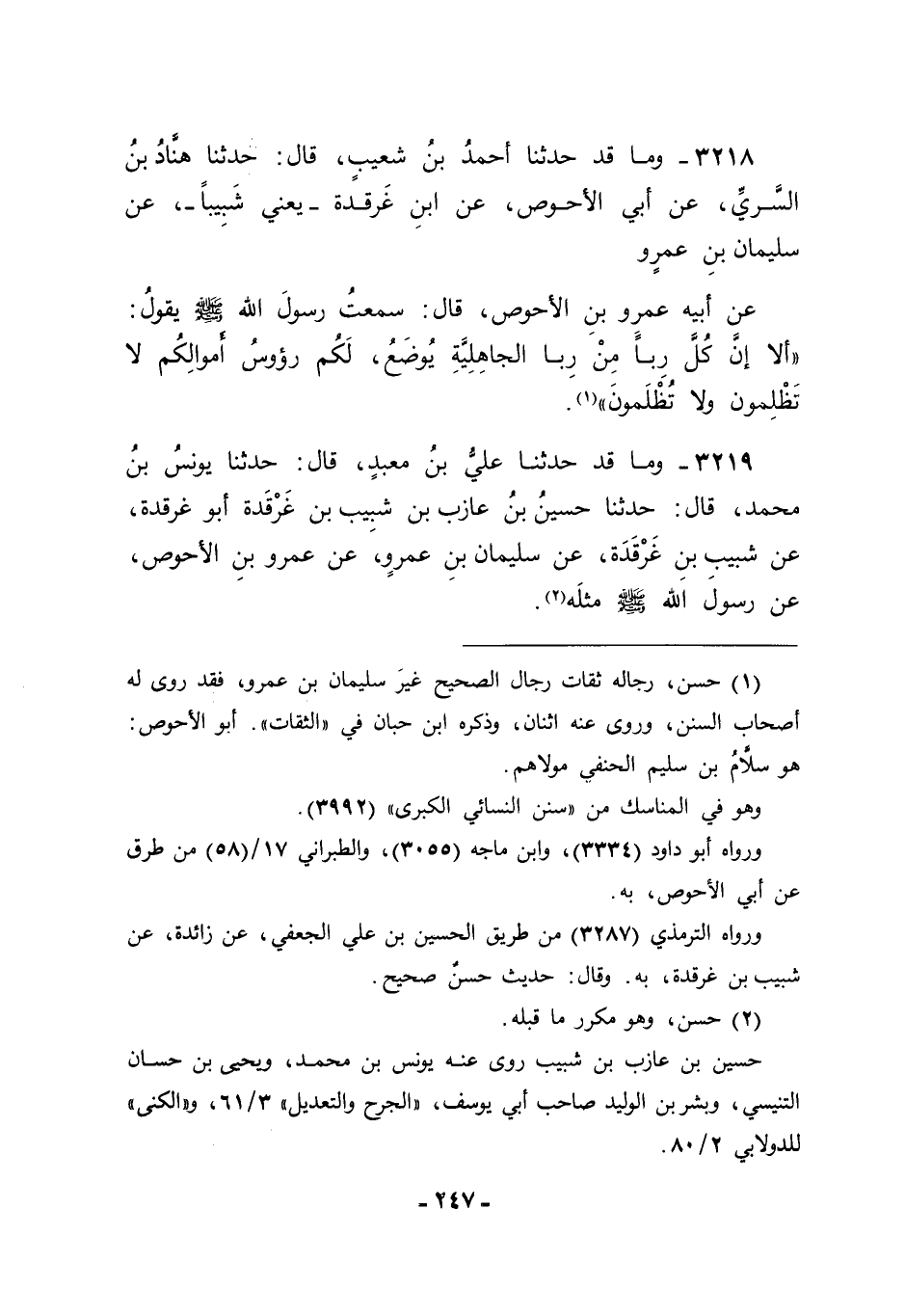 3218 - وَمَا قَدْ حَدَّثَنَا أَحْمَدُ بْنُ شُعَيْبٍ قَالَ: حَدَّثَنَا هَنَّادُ بْنُ السَّرِيِّ، عَنْ أَبِي الْأَحْوَصِ، عَنِ ابْنِ غَرْقَدَةَ يَعْنِي شَبِيبًا، عَنْ سُلَيْمَانَ بْنِ عَمْرٍو، عَنْ أَبِيهِ عَمْرِو بْنِ الْأَحْوَصِ قَالَ: سَمِعْتُ رَسُولَ اللهِ صَلَّى اللَّهُ عَلَيْهِ وَسَلَّمَ يَقُولُ: " أَلَا إنَّ كُلَّ رِبًا مِنْ رِبَا الْجَاهِلِيَّةِ يُوضَعُ، لَكُمْ رُءُوسُ أَمْوَالِكُمْ، لَا تَظْلِمُونَ وَلَا تُظْلَمُونَ ".