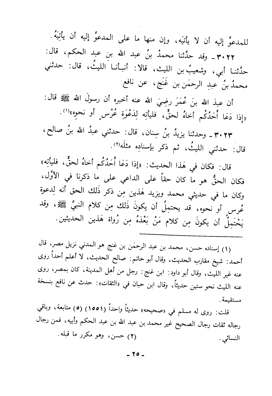 3023 - وَحَدَّثَنَا يَزِيدُ بْنُ سِنَانٍ قَالَ: حَدَّثَنِي عَبْدُ اللهِ بْنُ صَالِحٍ قَالَ: حَدَّثَنِي اللَّيْثُ، ثُمَّ ذَكَرَ بِإِسْنَادِهِ مِثْلَهُ. قَالَ: فَكَانَ فِي هَذَا الْحَدِيثِ " إذَا دَعَا أَحَدُكُمْ أَخَاهُ لِحَقٍّ فَلْيَأْتِهِ "، فَكَانَ الْحَقُّ هُوَ مَا كَانَ حَقًّا عَلَى الدَّاعِي عَلَى مَا ذَكَرْنَا فِي الْأَوَّلِ , وَكَانَ مَا فِي حَدِيثَيْ مُحَمَّدٍ وَيَزِيدَ هَذَيْنِ مِنْ ذِكْرِ ذَلِكَ الْحَقِّ أَنَّهُ لِدَعْوَةِ عُرْسٍ أَوْ نَحْوِهِ قَدْ يَحْتَمِلُ أَنْ يَكُونَ ذَلِكَ مِنْ كَلَامِ النَّبِيِّ صَلَّى اللَّهُ عَلَيْهِ وَسَلَّمَ، وَقَدْ يَحْتَمِلُ أَنْ يَكُونَ مِنْ كَلَامِ مَنْ بَعْدَهُ مِنْ رُوَاةِ هَذَيْنِ الْحَدِيثَيْنِ , -[26]- وَقَدْ رَوَى حَدِيثَ ابْنِ عُمَرَ هَذَا جَمَاعَةٌ عَنْ نَافِعٍ بِغَيْرِ ذِكْرِ هَذَا الْمَعْنَى الَّذِي هُوَ خِلَافُ الْعُرْسِ مِنْهُمْ عُمَرُ بْنُ مُحَمَّدٍ الْعُمَرِيُّ