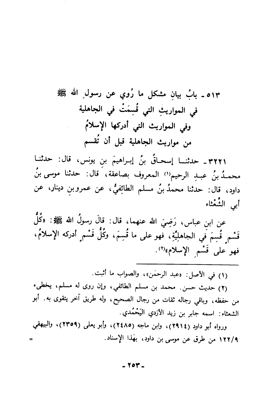 3221 - حَدَّثَنَا إِسْحَاقُ بْنُ إبْرَاهِيمَ بْنِ يُونُسَ قَالَ: حَدَّثَنَا مُحَمَّدُ بْنُ عَبْدِ الرَّحِيمِ الْمَعْرُوفُ بِصَاعِقَةَ، قَالَ: حَدَّثَنَا مُوسَى بْنُ دَاوُدَ قَالَ: حَدَّثَنَا مُحَمَّدُ بْنُ مُسْلِمٍ الطَّائِفِيُّ، عَنْ عَمْرِو بْنِ دِينَارٍ، عَنْ أَبِي الشَّعْثَاءِ، عَنِ ابْنِ عَبَّاسٍ رَضِيَ اللهُ عَنْهُمَا قَالَ: قَالَ رَسُولُ اللهِ صَلَّى اللَّهُ عَلَيْهِ وَسَلَّمَ: " كُلُّ قَسْمٍ قُسِمَ فِي الْجَاهِلِيَّةِ فَهُوَ عَلَى مَا قُسِمَ، وَكُلُّ قَسْمٍ أَدْرَكَهُ الْإِسْلَامُ فَهُوَ عَلَى قَسْمِ الْإِسْلَامِ ". -[254]- قَالَ أَبُو جَعْفَرٍ: فَأَمَّا ابْنُ عُيَيْنَةَ فَرَوَى هَذَا الْحَدِيثَ عَنْ عَمْرٍو فَلَمْ يَتَجَاوَزْهُ بِهِ.
