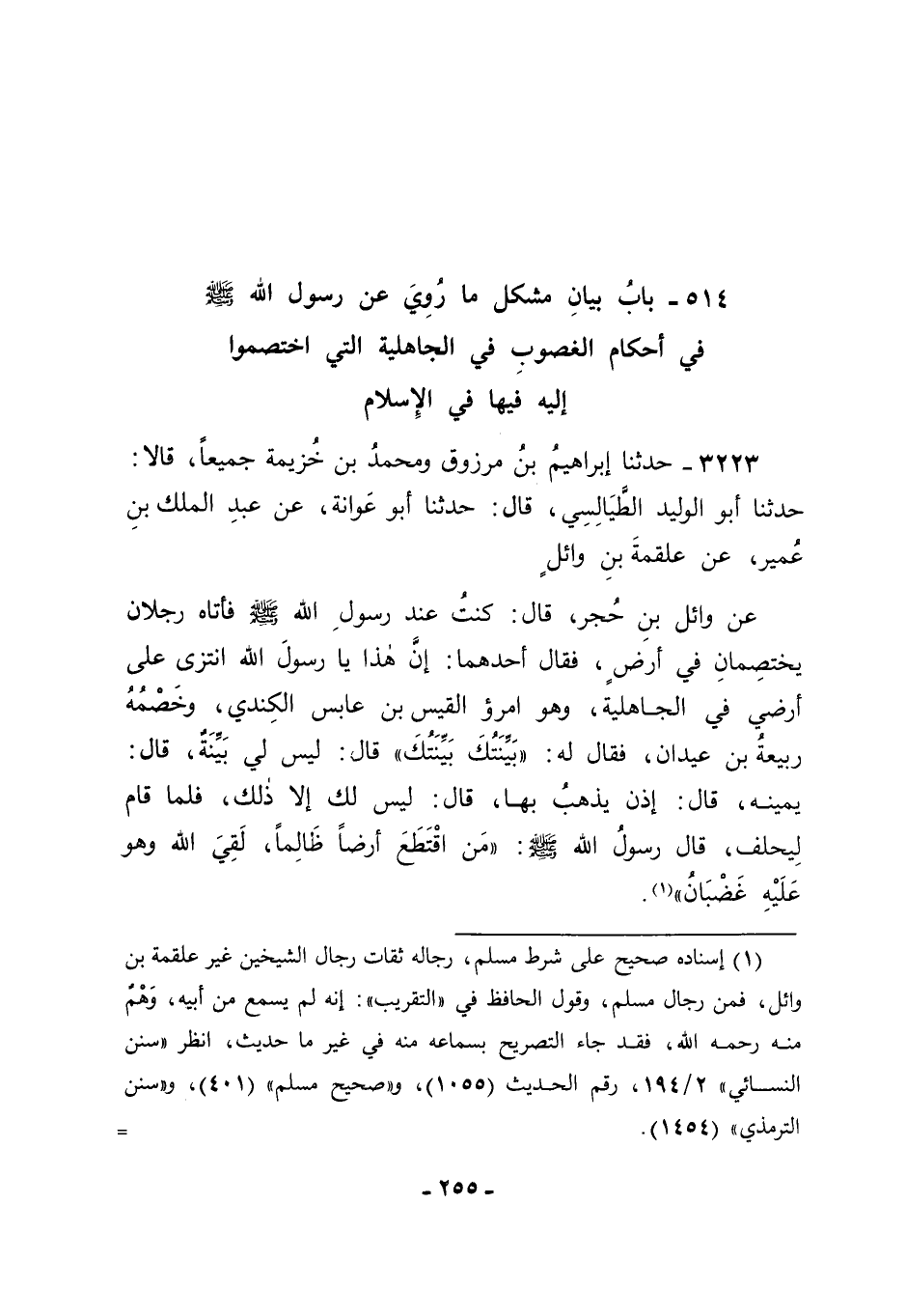 3223 - حَدَّثَنَا إبْرَاهِيمُ بْنُ مَرْزُوقٍ، وَمُحَمَّدُ بْنُ خُزَيْمَةَ جَمِيعًا قَالَا: حَدَّثَنَا أَبُو الْوَلِيدِ الطَّيَالِسِيُّ قَالَ: حَدَّثَنَا أَبُو عَوَانَةَ، عَنْ عَبْدِ الْمَلِكِ بْنِ عُمَيْرٍ، عَنْ عَلْقَمَةَ بْنِ وَائِلٍ، عَنْ وَائِلِ بْنِ حُجْرٍ قَالَ: " كُنْتُ عِنْدَ رَسُولِ اللهِ صَلَّى اللَّهُ عَلَيْهِ وَسَلَّمَ فَأَتَاهُ رَجُلَانِ يَخْتَصِمَانِ فِي أَرْضٍ، فَقَالَ أَحَدُهُمَا: إنَّ هَذَا يَا رَسُولَ اللهِ انْتَزَى عَلَى أَرْضِي فِي الْجَاهِلِيَّةِ، وَهُوَ امْرُؤُ الْقَيْسِ بْنُ عَابِسٍ الْكِنْدِيُّ، وَخَصْمُهُ رَبِيعَةُ بْنُ عَيْدَانَ، فَقَالَ لَهُ: " بَيِّنَتُكَ بَيِّنَتُكَ "، قَالَ: لَيْسَ لِي بَيِّنَةٌ، قَالَ: " يَمِينُهُ "، قَالَ: إذَنْ يَذْهَبُ بِهَا، قَالَ: " لَيْسَ لَكَ إِلَّا ذَلِكَ "، فَلَمَّا قَامَ لِيَحْلِفَ قَالَ رَسُولُ اللهِ صَلَّى اللَّهُ عَلَيْهِ وَسَلَّمَ: " مَنِ اقْتَطَعَ أَرْضًا ظَالِمًا لَقِيَ اللهَ وَهُوَ عَلَيْهِ غَضْبَانُ "