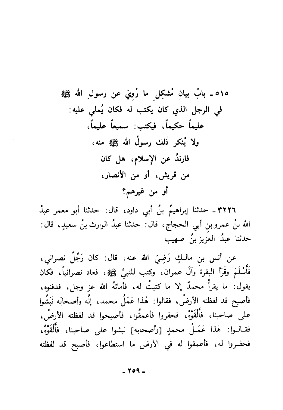 3226 - حَدَّثَنَا إبْرَاهِيمُ بْنُ أَبِي دَاوُدَ قَالَ: حَدَّثَنَا أَبُو مَعْمَرٍ عَبْدُ اللهِ بْنُ عَمْرِو بْنِ أَبِي الْحَجَّاجِ قَالَ: حَدَّثَنَا عَبْدُ الْوَارِثِ بْنُ سَعِيدٍ قَالَ: حَدَّثَنَا عَبْدُ الْعَزِيزِ بْنُ صُهَيْبٍ، عَنْ أَنَسِ بْنِ مَالِكٍ رَضِيَ اللهُ عَنْهُ قَالَ: " كَانَ رَجُلٌ نَصْرَانِيُّ فَأَسْلَمَ وَقَرَأَ الْبَقَرَةَ، وَآلَ عِمْرَانَ، وَكَتَبَ لِلنَّبِيِّ صَلَّى اللَّهُ عَلَيْهِ وَسَلَّمَ، فَعَادَ نَصْرَانِيًّا، فَكَانَ يَقُولُ: مَا يَقْرَأُ مُحَمَّدٌ إلَّا مَا كَتَبْتُ لَهُ، فَأَمَاتَهُ اللهُ عَزَّ وَجَلَّ، فَدَفَنُوهُ فَأَصْبَحَ قَدْ لَفَظَتْهُ الْأَرْضُ، فَقَالُوا: هَذَا عَمَلُ مُحَمَّدٍ، إنَّهُ وَأَصْحَابَهُ نَبَشُوا عَلَى صَاحِبِنَا فَأَلْقَوْهُ , فَحَفَرُوا فَأَعْمَقُوا، فَأَصْبَحُوا قَدْ لَفَظَتْهُ الْأَرْضُ، فَقَالُوا: هَذَا عَمَلُ مُحَمَّدٍ وَأَصْحَابِهِ، نَبَشُوا عَلَى صَاحِبِنَا فَأَلْقَوْهُ. فَحَفَرُوا لَهُ فَأَعْمَقُوا لَهُ فِي الْأَرْضِ مَا اسْتَطَاعُوا، فَأَصْبَحَ قَدْ لَفَظَتْهُ -[260]- الْأَرْضُ، فَعَلِمُوا أَنَّهُ لَيْسَ مِنَ النَّاسِ، فَأَلْقَوْهُ ". قَالَ أَبُو جَعْفَرٍ: فَبَانَ بِهَذَا الْحَدِيثِ بِحَمْدِ اللهِ أَنَّهُ لَمْ يَكُنْ مِنْ قُرَيْشٍ وَلَا مِنَ الْأَنْصَارِ، وَأَنَّهُ كَانَ نَصْرَانِيًّا. فَقَالَ قَائِلٌ: قَدْ ذَكَرْتَ قَبْلَ هَذَا الْبَابِ فِي كِتَابِكَ هَذَا مَا دَفَعْتَ أَنْ يَكُونَ هَذَا الرَّجُلُ كَانَ الَّذِي يُمْلِي عَلَيْهِ رَسُولُ اللهِ صَلَّى اللَّهُ عَلَيْهِ وَسَلَّمَ وَيَكْتُبُ خِلَافَهُ يُمْضِيهِ لَهُ رَسُولُ اللهِ صَلَّى اللَّهُ عَلَيْهِ وَسَلَّمَ مِنْ مَعْنَى مَا أَمْلَى عَلَيْهِ مَعْنَى مَا كَتَبَهُ، وَفِي هَذَا الْحَدِيثِ أَنَّ ذَلِكَ الرَّجُلَ كَانَ يَقُولُ: مَا يَقْرَأُ مُحَمَّدٌ إِلَّا مَا كَتَبْتُ لَهُ , فَفِي ذَلِكَ مَا قَدْ دَلَّ أَنَّ الَّذِي كَانَ يَكْتُبُهُ لِلنَّبِيِّ صَلَّى اللَّهُ عَلَيْهِ وَسَلَّمَ كَانَ مِنَ الْقُرْآنِ. فَكَانَ جَوَابُنَا لَهُ فِي ذَلِكَ بِتَوْفِيقِ اللهِ عَزَّ وَجَلَّ وَعَوْنِهِ: أَنَّهُ لَيْسَ فِي هَذَا الَّذِي ذَكَرَهُ مَا يَجِبُ أَنْ يَكُونَ الَّذِي كَانَ يَكْتُبُهُ لِلنَّبِيِّ صَلَّى اللَّهُ عَلَيْهِ وَسَلَّمَ كَانَ قُرْآنًا، إذْ كَانَ قَدْ يَحْتَمِلُ أَنْ يَكُونَ غَيْرَ قُرْآنٍ، مِمَّا كَانَ يَكْتُبُهُ إلَى مَنْ يَدْعُوهُ إلَى اللهِ عَزَّ وَجَلَّ مِنْ أَهْلِ الْكُفْرِ، ثُمَّ يَقْرَؤُهُ رَسُولُ اللهِ صَلَّى اللَّهُ عَلَيْهِ وَسَلَّمَ عَلَى النَّاسِ الَّذِينَ يَحْضُرُونَهُ لِيَسْمَعُوهُ وَيَعْلَمُوهُ , وَلَيْسَ ذَلِكَ عَلَى أَنَّهُ كَانَ يَقْرَؤُهُ بِنَفْسِهِ، وَلَكِنَّهُ كَانَ يَقْرَؤُهُ بِأَمْرِهِ، فَيَكُونُ ذَلِكَ قِرَاءَةً لَهُ، وَلَيْسَ كُلُّ مَقْرُوءٍ قُرْآنًا , قَالَ اللهُ تَعَالَى: {فَأَمَّا مَنْ أُوتِيَ كِتَابَهُ بِيَمِينِهِ -[261]- فَيَقُولُ هَاؤُمُ اقْرَءُوا كِتَابِيَهْ} , وَقَالَ عَزَّ وَجَلَّ: {اقْرَأْ كِتَابَكَ كَفَى بِنَفْسِكَ الْيَوْمَ عَلَيْكَ حَسِيبًا} [الإسراء: 14] , فِي نَظَائِرَ لِذَلِكَ فِي الْقُرْآنِ كَثِيرَةٍ، يُغْنِي مَا ذَكَرْنَاهُ مِنْهَا عَنْ ذِكْرِ بَقِيَّتِهَا. فَعَادَ مَعْنَى مَا فِي هَذَا الْحَدِيثِ إلَى مَا فِي الْحَدِيثِ الْأَوَّلِ وَلَيْسَ فِي وَاحِدٍ مِنْهُمَا مَا قَدْ دَلَّ عَلَى أَنَّ الَّذِي كَانَ يُمْلِيهِ رَسُولُ اللهِ صَلَّى اللَّهُ عَلَيْهِ وَسَلَّمَ عَلَى ذَلِكَ الرَّجُلِ فَيَكْتُبُ ذَلِكَ الرَّجُلُ خِلَافَهُ مِمَّا مَعْنَاهُ مَعْنَى الْقُرْآنِ فِي وَاحِدٍ مِنْ ذَيْنِكَ الْحَدِيثَيْنِ مِنَ الْقُرْآنِ , وَاللهَ عَزَّ وَجَلَّ نَسْأَلُهُ التَّوْفِيقَ.