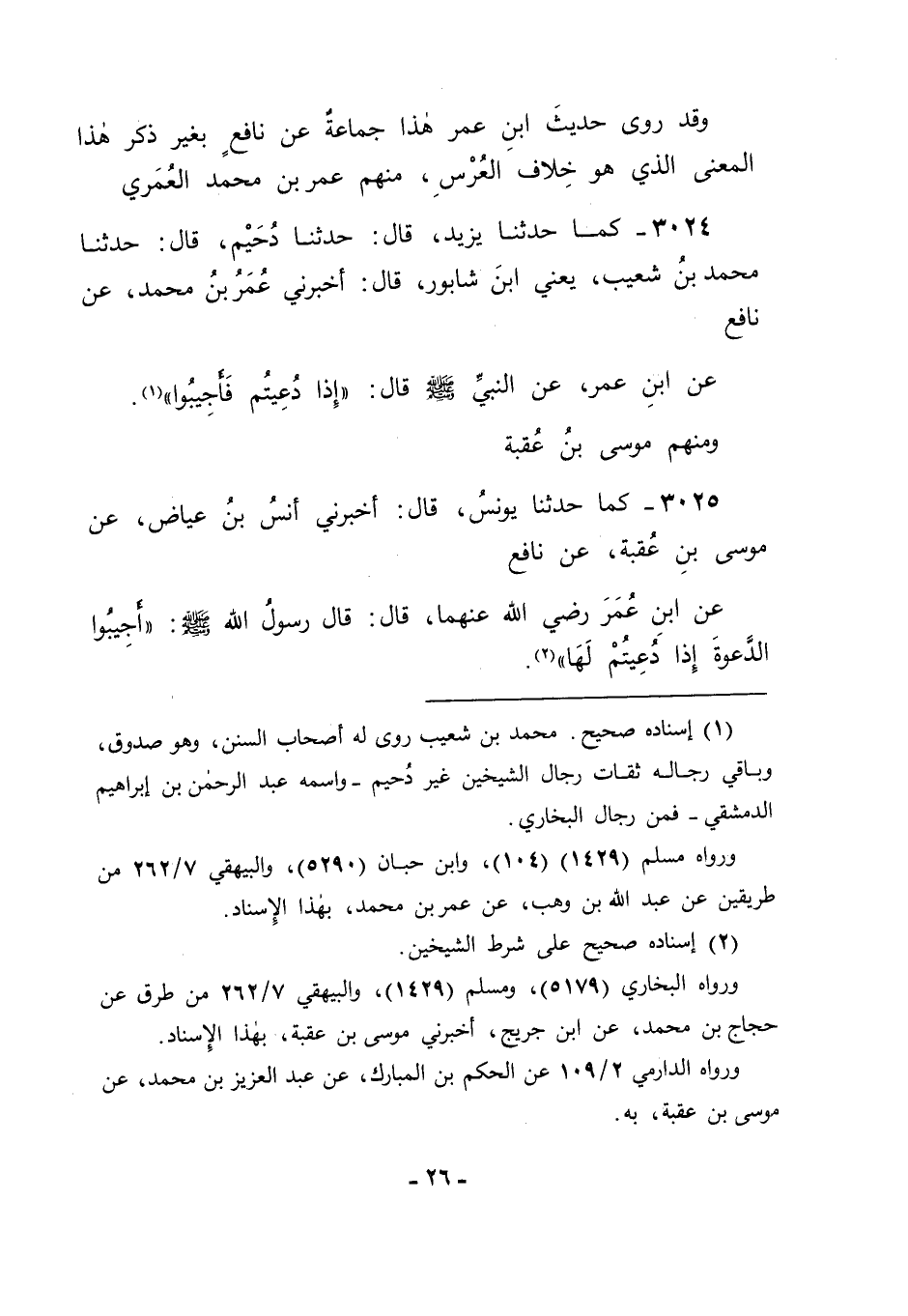 3025 - كَمَا حَدَّثَنَا يُونُسُ قَالَ: أَخْبَرَنِي أَنَسُ بْنُ عِيَاضٍ، عَنْ مُوسَى بْنِ عُقْبَةَ، عَنْ نَافِعٍ، عَنِ ابْنِ عُمَرَ رَضِيَ اللهُ عَنْهُمَا قَالَ: قَالَ رَسُولُ اللهِ صَلَّى اللَّهُ عَلَيْهِ وَسَلَّمَ: " أَجِيبُوا الدَّعْوَةَ إذَا دُعِيتُمْ لَهَا ". -[27]- وَمِنْهُمْ أَيُّوبُ السِّخْتِيَانِيُّ