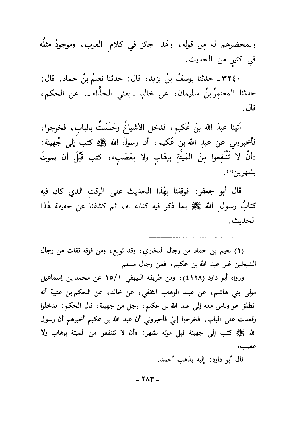 3240 - حَدَّثَنَا يُوسُفُ بْنُ يَزِيدَ قَالَ: حَدَّثَنَا نُعَيْمُ بْنُ حَمَّادٍ قَالَ: حَدَّثَنَا الْمُعْتَمِرُ بْنُ سُلَيْمَانَ، عَنْ خَالِدٍ يَعْنِي الْحَذَّاءَ، عَنِ الْحَكَمِ قَالَ: " أَتَيْنَا عَبْدَ اللهِ بْنَ عُكَيْمٍ فَدَخَلَ الْأَشْيَاخُ وَجَلَسْتُ بِالْبَابِ، فَخَرَجُوا، فَأَخْبَرُونِي , عَنْ عَبْدِ اللهِ بْنِ عُكَيْمٍ , أَنَّ رَسُولَ اللهِ صَلَّى اللَّهُ عَلَيْهِ وَسَلَّمَ كَتَبَ إلَى جُهَيْنَةَ: " أَنْ لَا تَنْتَفِعُوا مِنَ الْمَيْتَةِ بِإِهَابٍ وَلَا بِعَصَبٍ ". كَتَبَ قَبْلَ أَنْ يَمُوتَ بِشَهْرَيْنِ ". قَالَ أَبُو جَعْفَرٍ: فَوَقَفْنَا بِهَذَا الْحَدِيثِ عَلَى الْوَقْتِ الَّذِي كَانَ فِيهِ كِتَابُ رَسُولِ اللهِ صَلَّى اللَّهُ عَلَيْهِ وَسَلَّمَ بِمَا ذَكَرَ فِيهِ كِتَابَهُ بِهِ، ثُمَّ كَشَفْنَا عَنْ حَقِيقَةِ هَذَا الْحَدِيثِ.