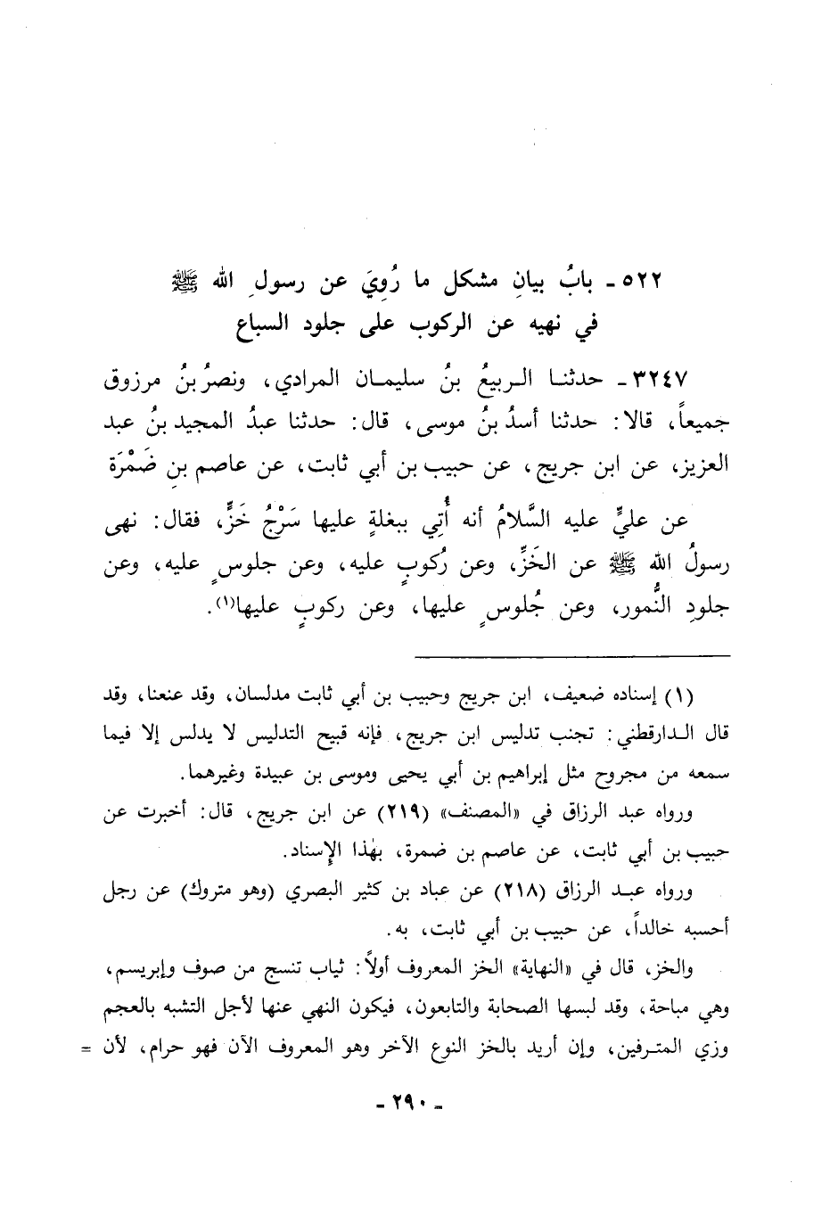 3247 - حَدَّثَنَا الرَّبِيعُ بْنُ سُلَيْمَانَ الْمُرَادِيُّ، وَنَصْرُ بْنُ مَرْزُوقٍ، جَمِيعًا قَالَا: حَدَّثَنَا أَسَدُ بْنُ مُوسَى قَالَ: حَدَّثَنَا عَبْدُ الْمَجِيدِ بْنُ عَبْدِ الْعَزِيزِ، عَنِ ابْنِ جُرَيْجٍ، عَنْ حَبِيبِ بْنِ أَبِي ثَابِتٍ، عَنْ عَاصِمِ بْنِ ضَمْرَةَ، عَنْ عَلِيٍّ عَلَيْهِ السَّلَامُ أَنَّهُ أُتِيَ بِبَغْلَةٍ عَلَيْهَا سَرْجُ خَزٍّ، فَقَالَ: " نَهَى رَسُولُ اللهِ صَلَّى اللَّهُ عَلَيْهِ وَسَلَّمَ عَنِ الْخَزِّ، وَعَنْ رُكُوبٍ عَلَيْهِ، وَعَنْ جُلُوسٍ عَلَيْهِ، وَعَنْ جُلُودِ النُّمُورِ، وَعَنْ جُلُوسٍ عَلَيْهَا، وَعَنِ الرُّكُوبِ عَلَيْهَا "