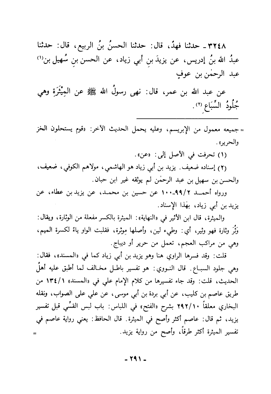 3248 - حَدَّثَنَا فَهْدٌ قَالَ: حَدَّثَنَا الْحَسَنُ بْنُ الرَّبِيعِ قَالَ: حَدَّثَنَا عَبْدُ اللهِ بْنُ إدْرِيسَ، عَنْ يَزِيدَ بْنِ أَبِي زِيَادٍ، عَنِ الْحَسَنِ بْنِ سُهَيْلِ بْنِ عَبْدِ الرَّحْمَنِ بْنِ عَوْفِ، عَنْ عَبْدِ اللهِ بْنِ عُمَرَ قَالَ: " نَهَى رَسُولُ اللهِ صَلَّى اللَّهُ عَلَيْهِ وَسَلَّمَ عَنِ الْمِيثَرَةِ، وَهِيَ جُلُودُ السِّبَاعِ "