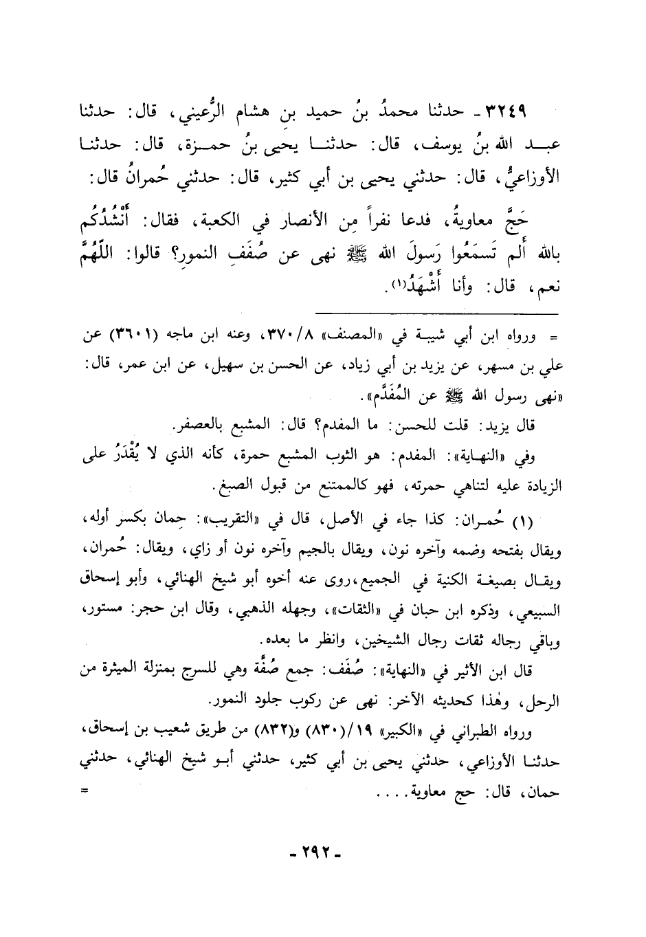 3249 - حَدَّثَنَا مُحَمَّدُ بْنُ حُمَيْدِ بْنِ هِشَامٍ الرُّعَيْنِيُّ قَالَ: حَدَّثَنَا عَبْدُ اللهِ بْنُ يُوسُفَ قَالَ: حَدَّثَنَا يَحْيَى بْنُ حَمْزَةَ قَالَ: حَدَّثَنَا الْأَوْزَاعِيُّ قَالَ: حَدَّثَنِي يَحْيَى بْنُ أَبِي كَثِيرٍ قَالَ: حَدَّثَنِي حُمْرَانَ قَالَ: حَجَّ مُعَاوِيَةُ فَدَعَا نَفَرًا مِنَ الْأَنْصَارِ فِي الْكَعْبَةِ، فَقَالَ: " أَنْشُدُكُمْ بِاللهِ، أَلَمْ تَسْمَعُوا رَسُولَ اللهِ صَلَّى اللَّهُ عَلَيْهِ وَسَلَّمَ نَهَى عَنْ صُفَفِ النُّمُورِ؟ قَالُوا: اللهُمَّ نَعَمْ، قَالَ: وَأَنَا أَشْهَدُ "
