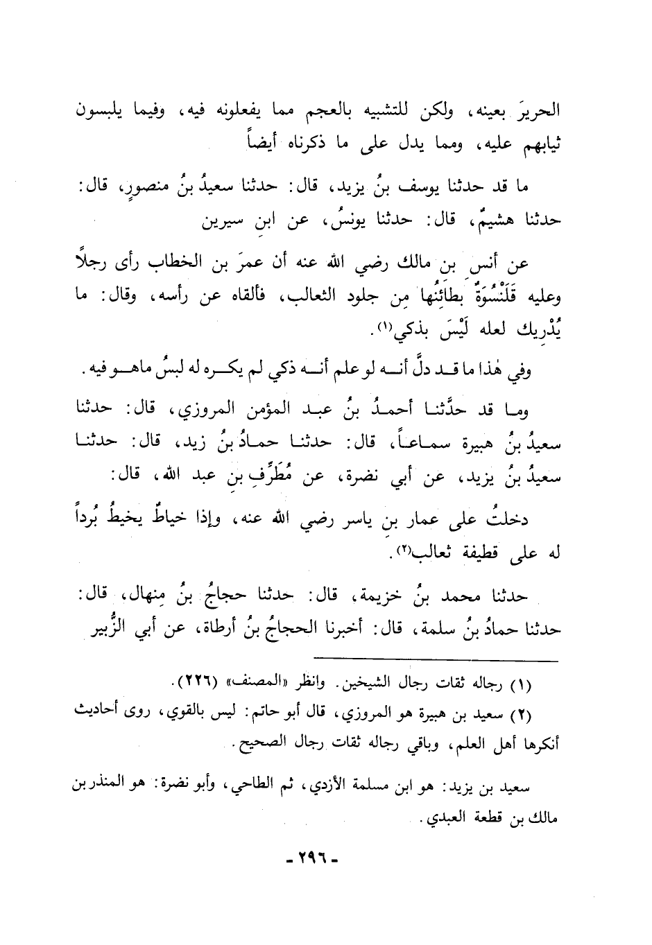 وَمَا قَدْ حَدَّثَنَا أَحْمَدُ بْنُ عَبْدِ الْمُؤْمِنِ الْمَرْوَزِيُّ قَالَ: حَدَّثَنَا سَعِيدُ بْنُ هُبَيْرَةَ سَمَاعًا قَالَ: حَدَّثَنَا حَمَّادُ بْنُ زَيْدٍ قَالَ: حَدَّثَنَا سَعِيدُ بْنُ يَزِيدَ، عَنْ أَبِي نَضْرَةَ، عَنْ مُطَرِّفِ بْنِ عَبْدِ اللهِ قَالَ: " دَخَلْتُ عَلَى عَمَّارِ بْنِ يَاسِرٍ رَضِيَ اللهُ عَنْهُ , وَإِذَا خَيَّاطٌ يَخِيطُ بُرْدًا لَهُ عَلَى قَطِيفَةِ ثَعَالِبَ "