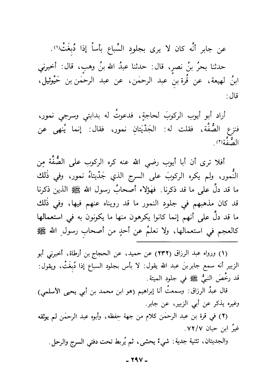 حَدَّثَنَا بَحْرُ بْنُ نَصْرٍ قَالَ: حَدَّثَنَا عَبْدُ اللهِ بْنُ وَهْبٍ قَالَ: أَخْبَرَنِي ابْنُ لَهِيعَةَ، عَنْ قُرَّةَ بْنِ عَبْدِ الرَّحْمَنِ، عَنْ عَبْدِ الرَّحْمَنِ بْنِ حَيْوَئِيلَ قَالَ: أَرَادَ أَبُو أَيُّوبَ الرُّكُوبَ لِحَاجَةٍ، فَدَعَوْتُ لَهُ بِدَابَّتِي وَسَرْجِي نُمُورٌ، فَنَزَعَ الصُّفَّةَ، فَقُلْتُ لَهُ: الْجَدْيَتَانِ نُمُورٌ، فَقَالَ: " إنَّمَا يُنْهَى عَنِ الصُّفَّةِ ". أَفَلَا تَرَى أَنَّ أَبَا أَيُّوبَ رَضِيَ اللهُ عَنْهُ كَرِهَ الرُّكُوبَ عَلَى الصُّفَّةِ مِنَ النُّمُورِ، وَلَمْ يَكْرَهِ الرُّكُوبَ عَلَى السَّرْجِ الَّذِي جَدْيَتَاهُ نُمُورٌ، وَفِي ذَلِكَ مَا قَدْ دَلَّ عَلَى مَا قَدْ ذَكَرْنَا. فَهَؤُلَاءِ أَصْحَابُ رَسُولِ اللهِ صَلَّى اللَّهُ عَلَيْهِ وَسَلَّمَ الَّذِينَ ذَكَرْنَا، قَدْ كَانَ مَذْهَبُهُمْ فِي جُلُودِ النُّمُورِ مَا قَدْ رُوِّينَاهُ عَنْهُمْ فِيهَا، وَفِي ذَلِكَ مَا قَدْ دَلَّ عَلَى أَنَّهُمْ إنَّمَا كَانُوا يَكْرَهُونَ مِنْهَا مَا يَكُونُونَ بِهِ فِي اسْتِعْمَالِهَا كَالْعَجَمِ فِي اسْتِعْمَالِهَا، وَلَا نَعْلَمُ عَنْ أَحَدٍ مِنْ أَصْحَابِ رَسُولِ اللهِ صَلَّى اللَّهُ عَلَيْهِ وَسَلَّمَ -[298]- فِي ذَلِكَ غَيْرَ مَا قَدْ ذَكَرْنَا. وَقَدْ وَجَدْنَا عَنْ تَابِعِيهِمْ رَضِيَ اللهُ عَنْهُمْ فِي ذَلِكَ مَا قَدْ دَلَّ عَلَى إبَاحَتِهَا أَيْضًا، وَعَلَى أَنَّ الْكَرَاهَةَ الَّتِي لَحِقَتْهَا مِنْ أَجْلِ مَا ذَكَرْنَا لَا مِمَّا سِوَاهُ مِمَّا يُوجِبُ تَحْرِيمَهَا