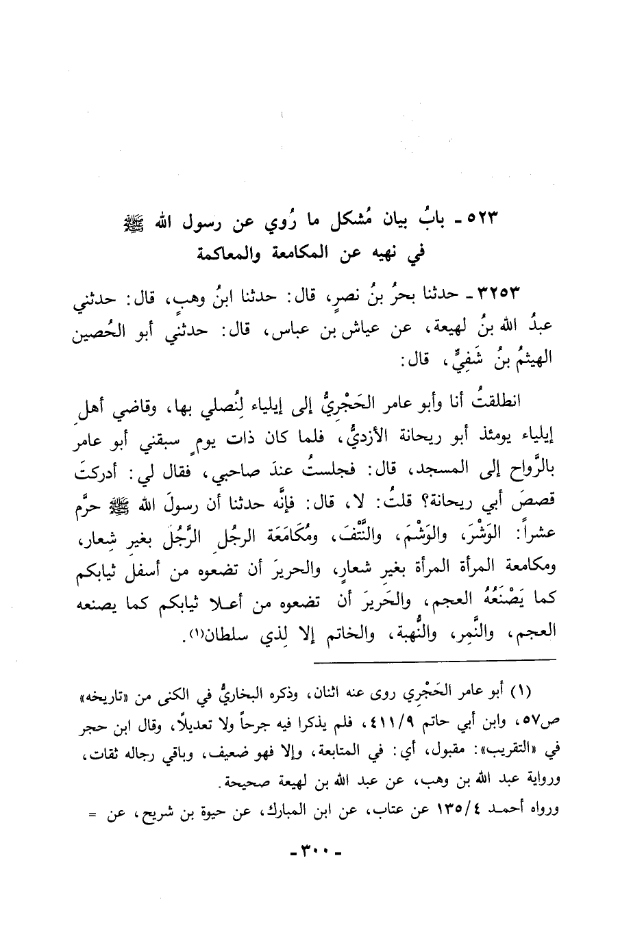 3253 - حَدَّثَنَا بَحْرُ بْنُ نَصْرٍ قَالَ: حَدَّثَنَا ابْنُ وَهْبٍ قَالَ: أَنَا عَبْدُ اللهِ بْنُ لَهِيعَةَ، عَنْ عَيَّاشِ بْنِ عَبَّاسٍ قَالَ: حَدَّثَنِي أَبُو الْحُصَيْنِ الْهَيْثَمُ بْنُ شُفَيٍّ قَالَ: انْطَلَقْتُ أَنَا وَأَبُو عَامِرٍ الْحَجْرِيُّ إلَى إِيلِيَاءَ لِنُصَلِّيَ بِهَا، وَقَاضِي أَهْلِ إِيلِيَاءَ يَوْمَئِذٍ أَبُو رَيْحَانَةَ الْأَزْدِيُّ، فَلَمَّا كَانَ ذَاتَ يَوْمٍ سَبَقَنِي أَبُو عَامِرٍ بِالرَّوَاحِ إلَى الْمَسْجِدِ، قَالَ: فَجَلَسْتُ عِنْدَ صَاحِبِي، فَقَالَ لِي: أَدْرَكْتَ قَصَصَ أَبِي رَيْحَانَةَ؟ قُلْتُ: لَا، قَالَ: فَإِنَّهُ حَدَّثَنَا: " أَنَّ رَسُولَ اللهِ صَلَّى اللَّهُ عَلَيْهِ وَسَلَّمَ حَرَّمَ عَشْرًا: الْوَشْرَ، وَالْوَشْمَ، وَالنَّتْفَ، وَمُكَامَعَةَ الرَّجُلِ الرَّجُلَ بِغَيْرِ شِعَارٍ، وَمُكَامَعَةَ الْمَرْأَةِ الْمَرْأَةَ بِغَيْرِ شِعَارٍ، وَالْحَرِيرَ أَنْ تَضَعُوهُ مِنْ أَسْفَلِ ثِيَابِكُمْ كَمَا يَصْنَعُهُ الْعَجَمُ، وَالْحَرِيرَ أَنْ تَضَعُوهُ مِنْ أَعْلَى ثِيَابِكُمْ كَمَا يَصْنَعُهُ الْعَجَمُ، وَالنَّمِرَ، وَالنُّهْبَةَ، وَالْخَاتَمَ إلَّا لِذِي سُلْطَانٍ ". -[301]-