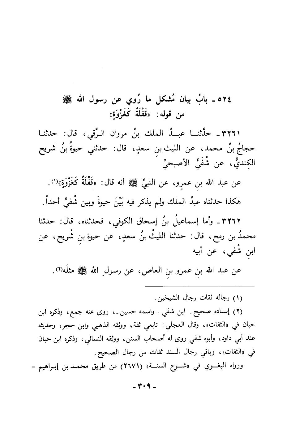 3261 - حَدَّثَنَا عَبْدُ الْمَلِكِ بْنِ مَرْوَانَ الرَّقِّيُّ قَالَ: حَدَّثَنَا حَجَّاجُ بْنُ مُحَمَّدٍ، عَنِ اللَّيْثِ بْنِ سَعْدٍ قَالَ: حَدَّثَنِي حَيْوَةُ بْنُ شُرَيْحٍ الْكِنْدِيُّ، عَنْ شُفَيٍّ الْأَصْبَحِيِّ، عَنْ عَبْدِ اللهِ بْنِ عَمْرٍو، عَنِ النَّبِيِّ صَلَّى اللَّهُ عَلَيْهِ وَسَلَّمَ أَنَّهُ قَالَ: " قَفْلَةٌ كَغَزْوَةٍ ". هَكَذَا حَدَّثَنَاهُ عَبْدُ الْمَلِكِ، وَلَمْ يَذْكُرْ فِيهِ بَيْنَ حَيْوَةَ وَبَيْنَ شُفَيٍّ أَحَدًا.