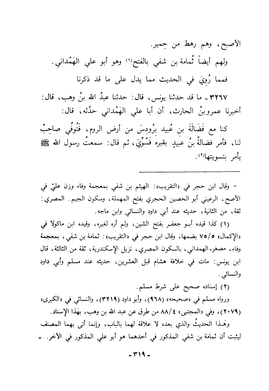3267 - مَا قَدْ حَدَّثَنَا يُونُسُ قَالَ: حَدَّثَنَا عَبْدُ اللهِ بْنُ وَهْبٍ قَالَ: أَخْبَرَنَا عَمْرُو بْنُ الْحَارِثِ، أَنَّ أَبَا عَلِيٍّ الْهَمْدَانِيَّ حَدَّثَهُ قَالَ: " كُنَّا مَعَ فَضَالَةَ بْنِ عُبَيْدٍ بِرُودِسَ مِنْ أَرْضِ الرُّومِ، فَتُوُفِّيَ صَاحِبٌ لَنَا، فَأَمَرَ فَضَالَةُ بْنُ عُبَيْدٍ بِقَبْرِهِ فَسُوِّيَ، ثُمَّ قَالَ: " سَمِعْتُ رَسُولُ اللهِ صَلَّى اللَّهُ عَلَيْهِ وَسَلَّمَ يَأْمُرُ بِتَسْوِيَتِهَا "