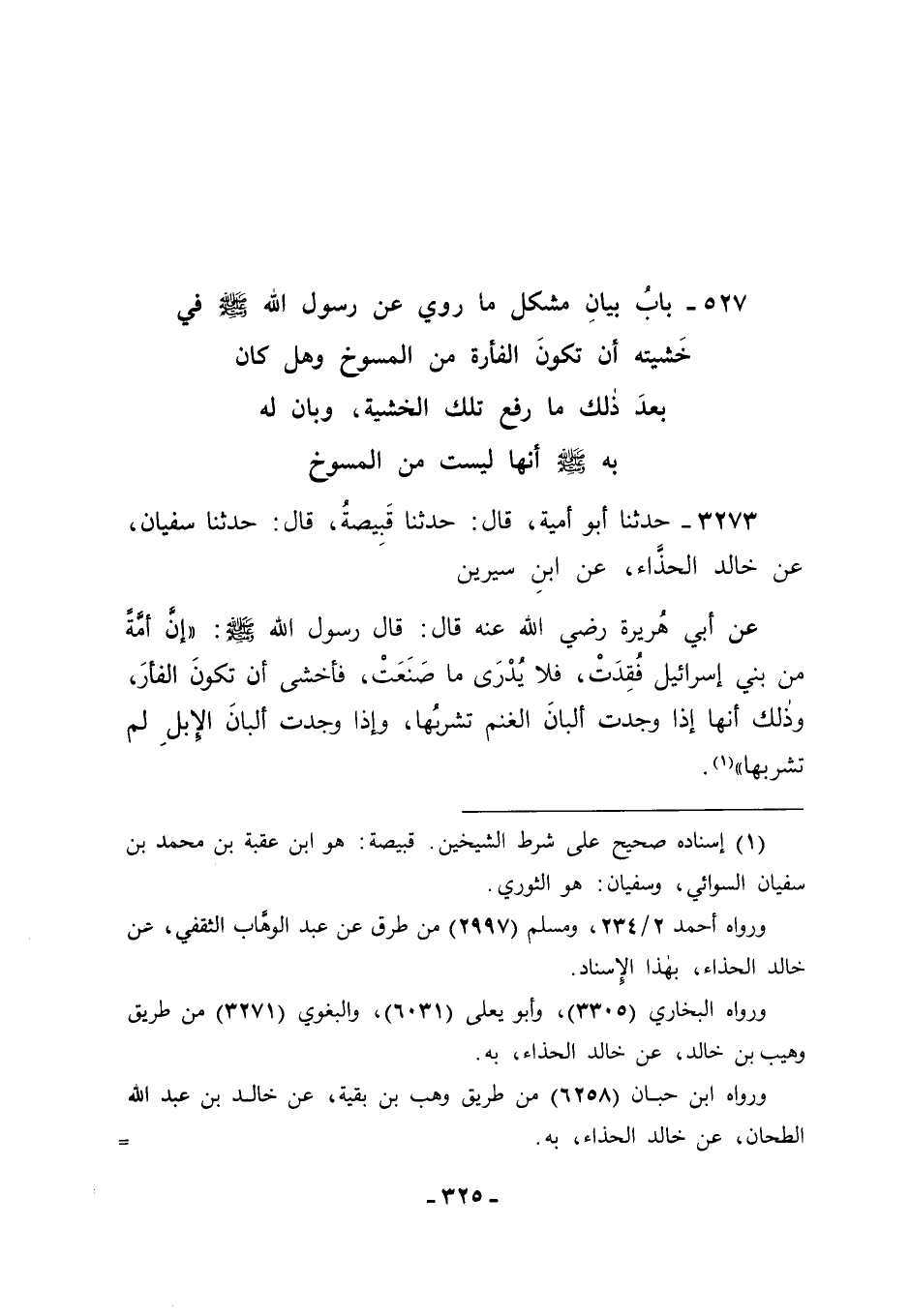 3273 - حَدَّثَنَا أَبُو أُمَيَّةَ قَالَ: حَدَّثَنَا قَبِيصَةُ قَالَ: حَدَّثَنَا سُفْيَانُ، عَنْ خَالِدٍ الْحَذَّاءِ، عَنِ ابْنِ سِيرِينَ، عَنْ أَبِي هُرَيْرَةَ رَضِيَ اللهُ عَنْهُ قَالَ: قَالَ رَسُولُ اللهِ صَلَّى اللَّهُ عَلَيْهِ وَسَلَّمَ: " إنَّ أُمَّةً مِنْ بَنِي إسْرَائِيلَ فُقِدَتْ فَلَا يُدْرَى مَا صَنَعَتْ، فَأَخْشَى أَنْ تَكُونَ الْفَأْرَ، وَذَلِكَ أَنَّهَا إذَا وَجَدَتْ أَلْبَانَ الْغَنَمِ تَشْرَبُهَا , وَإِذَا وَجَدَتْ أَلْبَانَ الْإِبِلِ لَمْ تَشْرَبُهَا "
