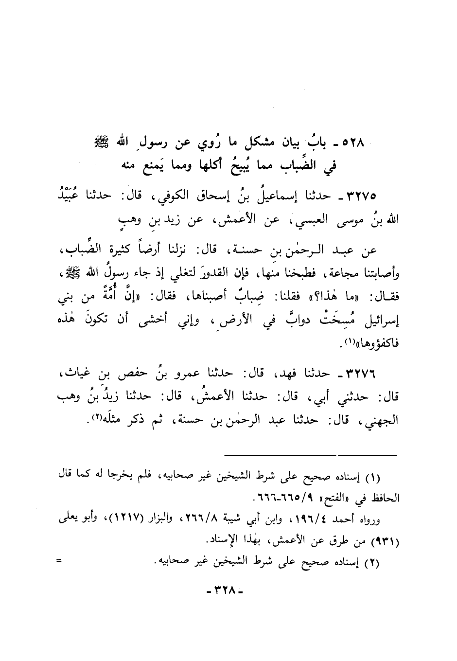 3276 - حَدَّثَنَا فَهْدٌ قَالَ: حَدَّثَنَا عُمَرُ بْنُ حَفْصِ بْنِ غِيَاثٍ قَالَ: حَدَّثَنِي أَبِي قَالَ: ثنا الْأَعْمَشُ قَالَ: حَدَّثَنَا زَيْدُ بْنُ وَهْبٍ الْجُهَنِيُّ قَالَ: حَدَّثَنَا عَبْدُ الرَّحْمَنِ بْنُ حَسَنَةَ، ثُمَّ ذَكَرَ مِثْلَهُ. -[329]- قَالَ أَبُو جَعْفَرٍ: هَكَذَا رَوَى هَذَا الْحَدِيثَ الْأَعْمَشُ، وَقَدْ رَوَاهُ حُصَيْنٌ فَخَالَفَهُ فِي إسْنَادِهِ.