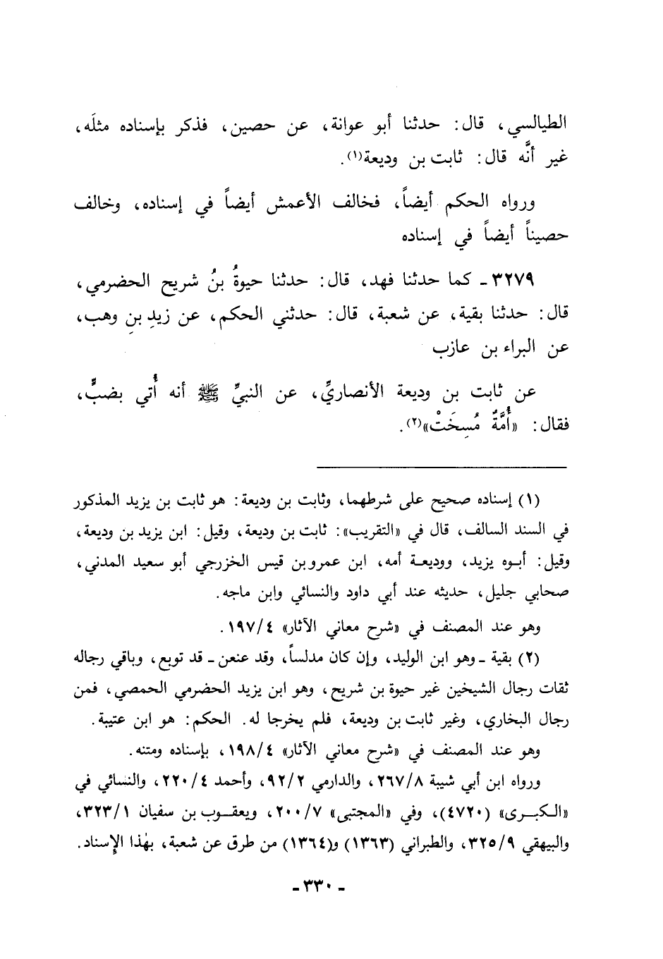 3279 - كَمَا حَدَّثَنَا فَهْدٌ قَالَ: حَدَّثَنَا حَيْوَةُ بْنُ شُرَيْحٍ الْحَضْرَمِيُّ قَالَ: حَدَّثَنَا بَقِيَّةُ، عَنْ شُعْبَةَ قَالَ: حَدَّثَنِي الْحَكَمُ، عَنْ زَيْدِ بْنِ وَهْبٍ، عَنِ الْبَرَاءِ بْنِ عَازِبٍ، عَنْ ثَابِتِ بْنِ وَدِيعَةَ الْأَنْصَارِيِّ: عَنِ النَّبِيِّ صَلَّى اللَّهُ عَلَيْهِ وَسَلَّمَ أَنَّهُ أُتِيَ بِضَبٍّ فَقَالَ: " أُمَّةٌ مُسِخَتْ "