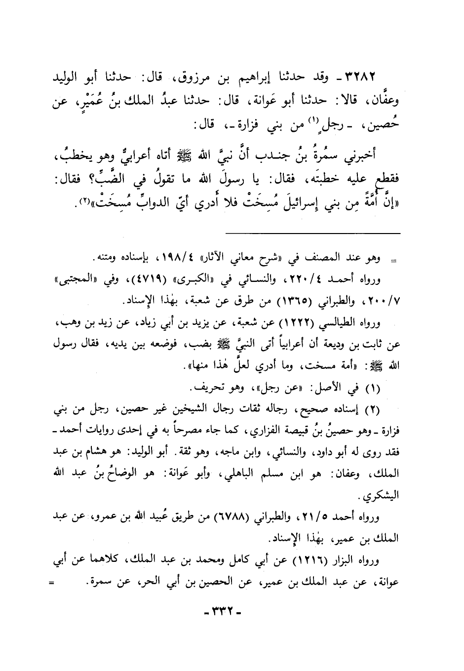 3282 - وَقَدْ حَدَّثَنَا إبْرَاهِيمُ بْنُ مَرْزُوقٍ قَالَ: حَدَّثَنَا أَبُو الْوَلِيدِ، وَعَفَّانُ قَالَا: حَدَّثَنَا أَبُو عَوَانَةَ قَالَ: حَدَّثَنَا عَبْدُ الْمَلِكِ بْنُ عُمَيْرٍ، عَنْ حُصَيْنٍ رَجُلٍ مِنْ بَنِي فَزَارَةَ قَالَ: أَخْبَرَنِي سَمُرَةَ بْنُ جُنْدُبٍ أَنَّ نَبِيَّ اللهِ صَلَّى اللَّهُ عَلَيْهِ وَسَلَّمَ أَتَاهُ أَعْرَابِيُّ وَهُوَ يَخْطُبُ فَقَطَعَ عَلَيْهِ خُطْبَتَهُ، فَقَالَ: يَا رَسُولَ اللهِ، مَا تَقُولُ فِي الضَّبِّ؟، فَقَالَ: " إنَّ أُمَّةً مِنْ بَنِي إسْرَائِيلَ مُسِخَتْ، فَلَا أَدْرِي أَيَّ الدَّوَابِّ مُسِخَتْ "