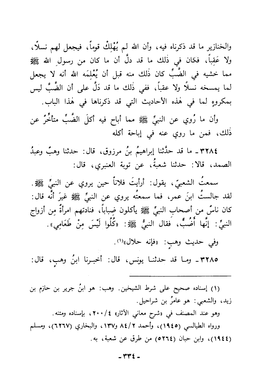 3284 - مَا قَدْ حَدَّثَنَا إبْرَاهِيمُ بْنُ مَرْزُوقٍ قَالَ: حَدَّثَنَا وَهْبٌ، وَعَبْدُ الصَّمَدِ قَالَا: حَدَّثَنَا شُعْبَةُ، عَنْ تَوْبَةَ الْعَنْبَرِيِّ قَالَ: سَمِعْتُ الشَّعْبِيَّ، يَقُولُ: أَرَأَيْتَ فُلَانًا حِينَ يَرْوِي عَنِ النَّبِيِّ صَلَّى اللَّهُ عَلَيْهِ وَسَلَّمَ. لَقَدْ جَالَسْتُ ابْنَ عُمَرَ، فَمَا سَمِعْتُهُ يَرْوِي عَنِ النَّبِيِّ صَلَّى اللَّهُ عَلَيْهِ وَسَلَّمَ غَيْرَ أَنَّهُ قَالَ: كَانَ نَاسٌ مِنْ أَصْحَابِ النَّبِيِّ صَلَّى اللَّهُ عَلَيْهِ وَسَلَّمَ يَأْكُلُونَ ضِبَابًا، فَنَادَتْهُمُ امْرَأَةٌ مِنْ أَزْوَاجِ النَّبِيِّ: إنَّهَا أَضُبٌّ، فَقَالَ النَّبِيُّ صَلَّى اللَّهُ عَلَيْهِ وَسَلَّمَ: " كُلُوا، لَيْسَ مِنْ طَعَامِي "، وَفِي حَدِيثِ وَهْبٍ " فَإِنَّهُ حَلَالٌ "