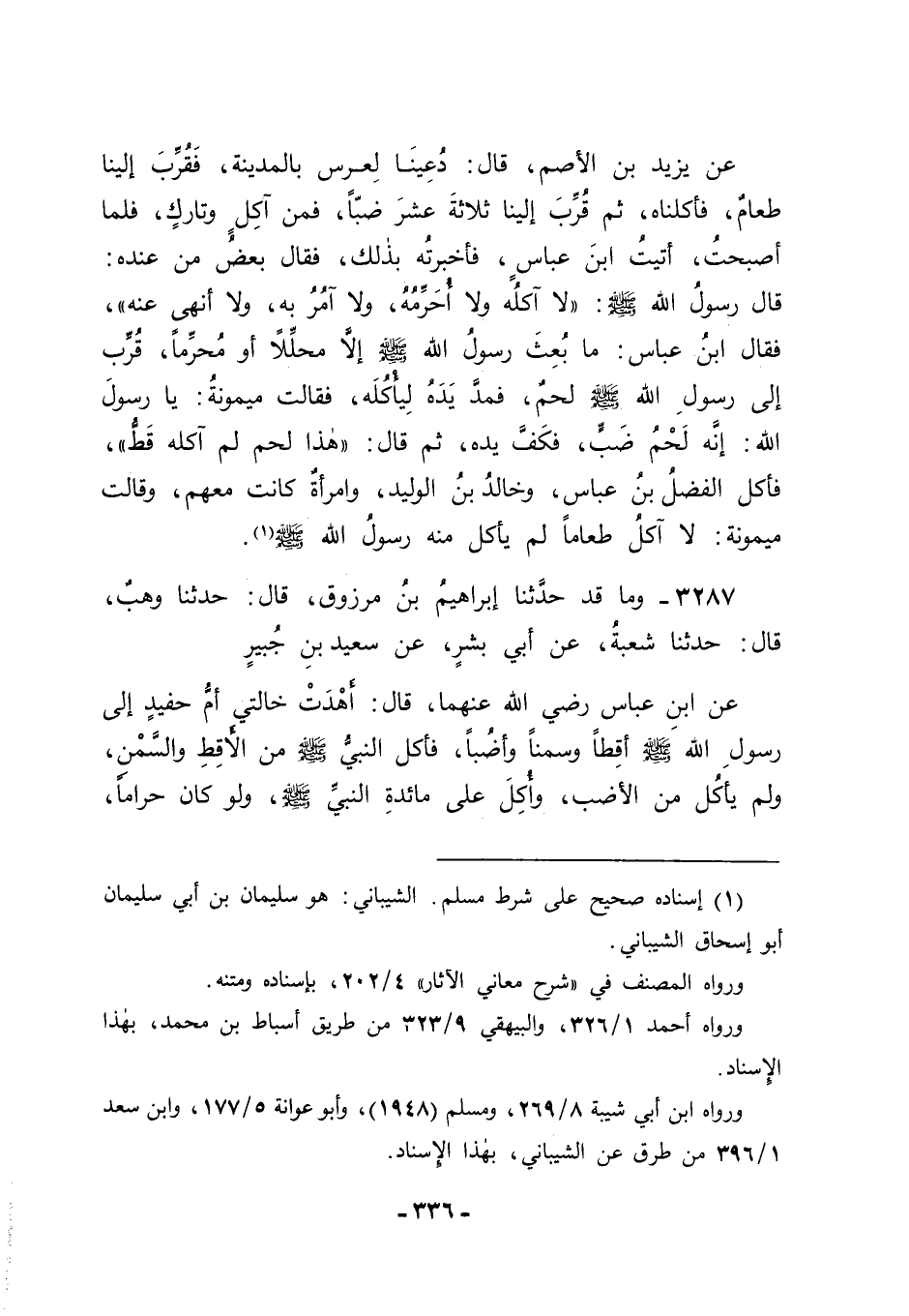 3287 - وَمَا قَدْ حَدَّثَنَا إبْرَاهِيمُ بْنُ مَرْزُوقٍ قَالَ: حَدَّثَنَا وَهْبٌ قَالَ: حَدَّثَنَا شُعْبَةُ، عَنْ أَبِي بُشْرٍ، عَنْ سَعِيدِ بْنِ جُبَيْرٍ، عَنِ ابْنِ عَبَّاسٍ رَضِيَ اللهُ عَنْهُمَا قَالَ: " أَهْدَتْ خَالَتِي أُمُّ حَفِيدٍ إلَى رَسُولِ اللهِ صَلَّى اللَّهُ عَلَيْهِ وَسَلَّمَ أَقِطًا وَسَمْنًا وَأَضُبًّا، فَأَكَلَ النَّبِيُّ صَلَّى اللَّهُ عَلَيْهِ وَسَلَّمَ مِنَ الْأَقِطِ وَالسَّمْنِ وَلَمْ يَأْكُلْ مِنَ الْأَضُبِّ، وَأُكِلَ عَلَى مَائِدَةِ النَّبِيِّ صَلَّى اللَّهُ عَلَيْهِ وَسَلَّمَ، وَلَوْ كَانَ حَرَامًا -[337]- لَمْ يُؤْكَلْ عَلَى مَائِدَةِ النَّبِيِّ صَلَّى اللَّهُ عَلَيْهِ وَسَلَّمَ "