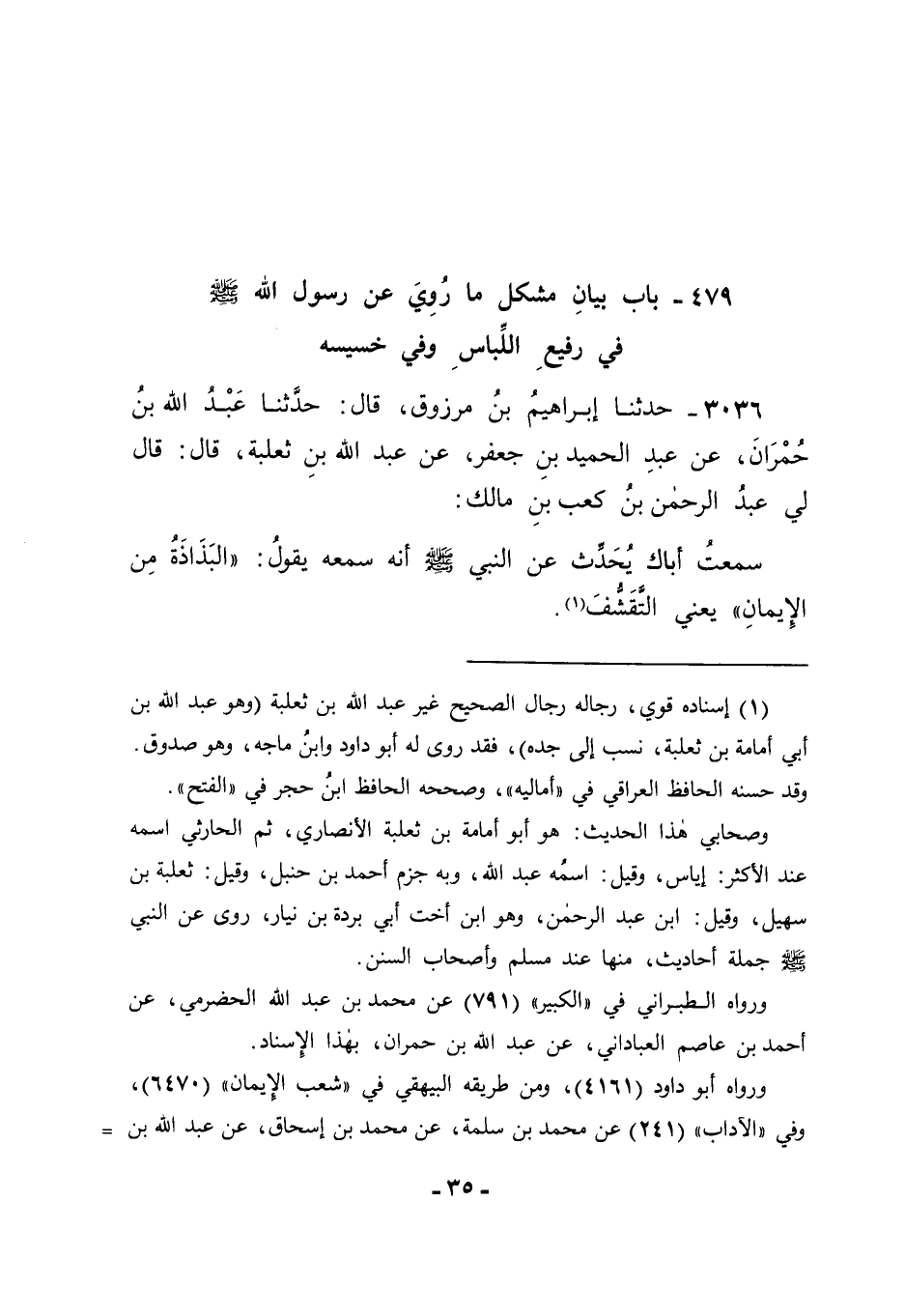3036 - حَدَّثَنَا إبْرَاهِيمُ بْنُ مَرْزُوقٍ قَالَ: حَدَّثَنَا عَبْدُ اللهِ بْنُ حُمْرَانَ، عَنْ عَبْدِ الْحَمِيدِ بْنِ جَعْفَرٍ، عَنْ عَبْدِ اللهِ بْنِ ثَعْلَبَةَ قَالَ: قَالَ لِي عَبْدُ الرَّحْمَنِ بْنُ كَعْبِ بْنِ مَالِكٍ: سَمِعْتُ أَبَاكَ يُحَدِّثُ عَنِ النَّبِيِّ صَلَّى اللَّهُ عَلَيْهِ وَسَلَّمَ أَنَّهُ سَمِعَهُ يَقُولُ: " الْبَذَاذَةُ مِنَ الْإِيمَانِ " يَعْنِي: التَّقَشُّفَ. -[37]- فَقَالَ قَائِلٌ: فَقَدْ رُوِّيتُمْ عَنْ رَسُولِ اللهِ صَلَّى اللَّهُ عَلَيْهِ وَسَلَّمَ مَا يُخَالِفُ مَا فِي هَذَا الْحَدِيثِ.