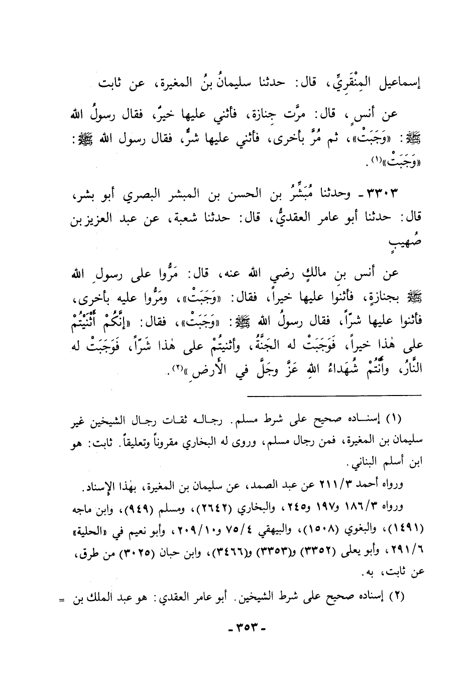 3303 - وَحَدَّثَنَا مُبَشِّرُ بْنُ الْحَسَنِ بْنِ الْمُبَشِّرِ الْبَصْرِيُّ أَبُو بِشْرٍ قَالَ: حَدَّثَنَا أَبُو عَامِرٍ الْعَقَدِيُّ قَالَ: حَدَّثَنَا شُعْبَةُ، عَنْ عَبْدِ الْعَزِيزِ بْنِ صُهَيْبٍ، عَنْ أَنَسِ بْنِ مَالِكٍ رَضِيَ اللهُ عَنْهُ قَالَ: " مَرُّوا عَلَى رَسُولِ اللهِ صَلَّى اللَّهُ عَلَيْهِ وَسَلَّمَ بِجِنَازَةٍ فَأَثْنَوْا عَلَيْهَا خَيْرًا، فَقَالَ: " وَجَبَتْ "، وَمَرُّوا عَلَيْهِ بِأُخْرَى فَأَثْنَوْا عَلَيْهَا شَرًّا، فَقَالَ رَسُولُ اللهِ صَلَّى اللَّهُ عَلَيْهِ وَسَلَّمَ: " وَجَبَتْ "، فَقَالَ: " إنَّكُمْ أَثْنَيْتُمْ عَلَى هَذَا خَيْرًا فَوَجَبَتْ لَهُ الْجَنَّةُ، وَأَثْنَيْتُمْ عَلَى هَذَا شَرًّا فَوَجَبَتْ لَهُ النَّارُ، وَأَنْتُمْ شُهَدَاءُ اللهِ عَزَّ وَجَلَّ فِي الْأَرْضِ "