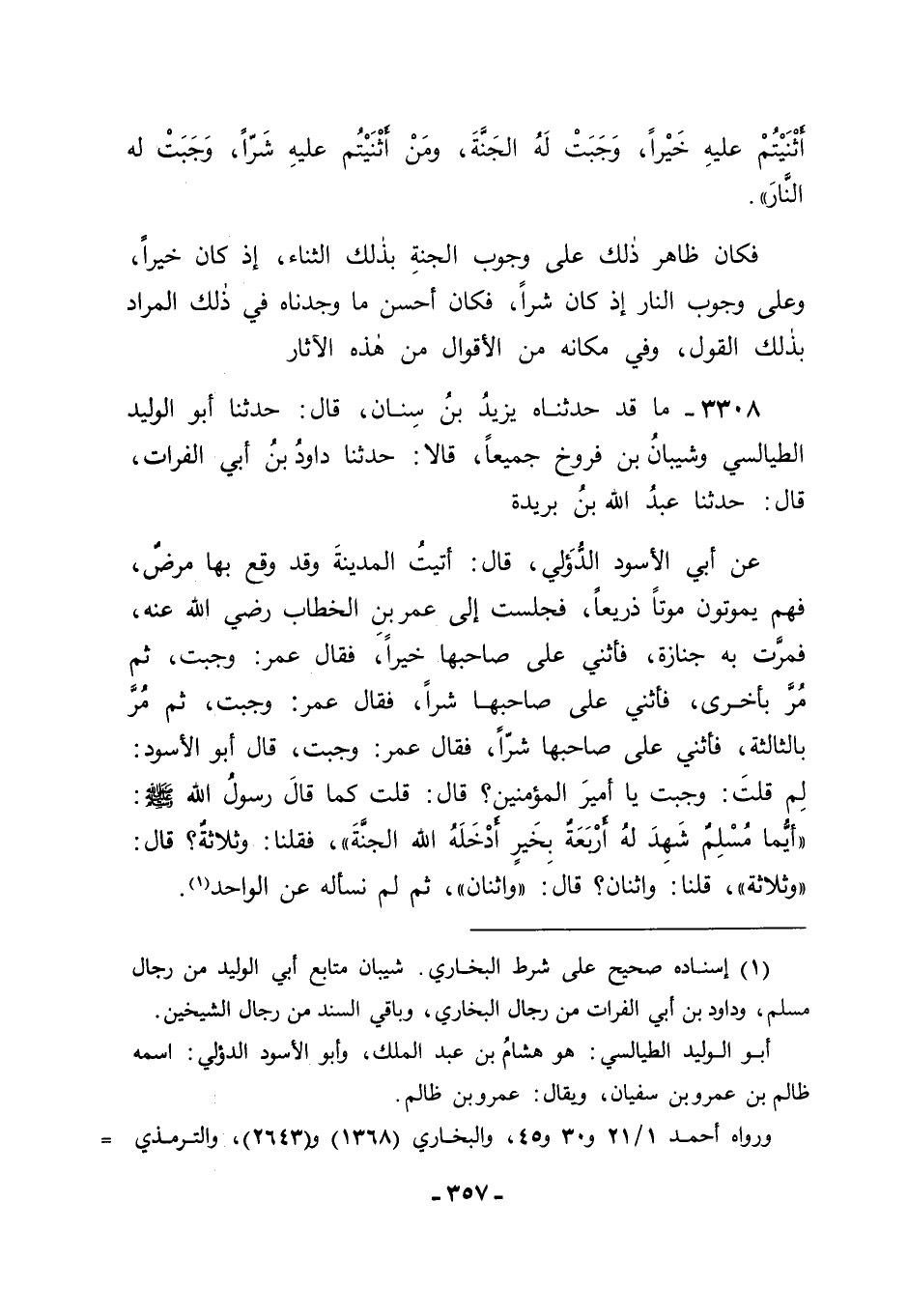 3308 - مَا قَدْ حَدَّثَنَاهُ يَزِيدُ بْنُ سِنَانٍ قَالَ: حَدَّثَنَا أَبُو الْوَلِيدِ الطَّيَالِسِيُّ، وَشَيْبَانُ بْنُ فَرُّوخَ، جَمِيعًا قَالَا: حَدَّثَنَا دَاوُدُ بْنُ أَبِي الْفُرَاتِ قَالَ: حَدَّثَنَا عَبْدُ اللهِ بْنُ بُرَيْدَةَ، عَنْ: أَبِي الْأَسْوَدِ الدُّؤَلِيِّ قَالَ: أَتَيْتُ الْمَدِينَةَ وَقَدْ وَقَعَ بِهَا مَرَضٌ، فَهُمْ يَمُوتُونَ مَوْتًا ذَرِيعًا، فَجَلَسْتُ إلَى عُمَرَ بْنِ الْخَطَّابِ رَضِيَ اللهُ عَنْهُ، فَمَرَّتْ بِهِ جِنَازَةٌ فَأُثْنِيَ عَلَى صَاحِبِهَا خَيْرًا، فَقَالَ عُمَرُ: " وَجَبَتْ " ثُمَّ مُرَّ بِأُخْرَى فَأُثْنِيَ عَلَى صَاحِبِهَا شَرًّا، فَقَالَ عُمَرُ: " وَجَبَتْ "، ثُمَّ مُرَّ بِالثَّالِثَةِ فَأُثْنِيَ عَلَى صَاحِبِهَا شَرًّا , فَقَالَ عُمَرُ: " وَجَبَتْ ". قَالَ: أَبُو الْأَسْوَدِ: لِمَ قُلْتَ: وَجَبَتْ، يَا أَمِيرَ الْمُؤْمِنِينَ؟ قَالَ: " قُلْتُ كَمَا قَالَ رَسُولُ اللهِ صَلَّى اللَّهُ عَلَيْهِ وَسَلَّمَ: " أَيُّمَا مُسْلِمٍ شَهِدَ لَهُ أَرْبَعَةٌ بِخَيْرٍ أَدْخَلَهُ اللهُ الْجَنَّةَ "، فَقُلْنَا: وَثَلَاثَةٌ؟ قَالَ: " وَثَلَاثَةٌ "، قُلْنَا: وَاثْنَانِ؟ قَالَ: " وَاثْنَانِ "، ثُمَّ لَمْ نَسْأَلْهُ عَنِ الْوَاحِدِ ". -[358]- قَالَ فَكَانَ وَجْهُ ذَلِكَ عِنْدَنَا وَاللهُ أَعْلَمُ أَنَّ الشَّهَادَةَ بِالْخَيْرِ لِمَنْ شُهِدَ لَهُ بِهِ سَتْرٌ مِنَ اللهِ عَزَّ وَجَلَّ عَلَيْهِ فِي الدُّنْيَا، وَمَنْ سَتَرَهُ اللهُ عَزَّ وَجَلَّ فِي الدُّنْيَا لَمْ يَرْفَعْ عَنْهُ سِتْرَهُ فِي الْآخِرَةِ، كَمَا رُوِيَ عَنْهُ صَلَّى اللَّهُ عَلَيْهِ وَسَلَّمَ، مِمَّا قَدْ رُوِّينَاهُ فِيمَا تَقَدَّمَ مِنَّا فِي كِتَابِنَا هَذَا: " ثَلَاثَةٌ أَشْهَدُ عَلَيْهِمْ، وَالرَّابِعَةُ لَوْ شَهِدْتُ لَرَجَوْتُ أَنْ لَا آثَمَ. . . " ثُمَّ ذَكَرَ الثَّلَاثَةَ، ثُمَّ قَالَ: " وَالرَّابِعَةُ: لَا يَسْتُرُ اللهُ عَزَّ وَجَلَّ عَلَى عَبْدٍ فِي الدُّنْيَا إلَّا سَتَرَ عَلَيْهِ فِي الْآخِرَةِ ". فَكَانَ ذَلِكَ الْوُجُوبُ هُوَ السِّتْرَ فِي الدُّنْيَا بِالثَّنَاءِ الْحَسَنِ , وَفِي الْآخِرَةِ بِالسِّتْرِ فِيهَا مِمَّا يَخَافُ فِيهَا , وَهُوَ النَّارُ، وَكَانَ الثَّنَاءُ بِالذَّمِّ فِي الدُّنْيَا هُوَ رَفْعَ السِّتْرِ عَنِ الَّذِي أُثْنِيَ عَلَيْهِ بِهِ، فَكَانَ فِي الدُّنْيَا ضِدًّا لِمَنْ أُثْنِيَ عَلَيْهِ بِالْخَيْرِ فِيهَا، فَكَانَ كَذَلِكَ هُوَ فِي الْآخِرَةِ يَكُونُ فِيهَا ضِدًّا لِمَنْ أُثْنِيَ عَلَيْهِ فِي الدُّنْيَا بِالْخَيْرِ , وَإِذَا كَانَ كَذَلِكَ اسْتَحَقَّ النَّارَ وَهَذَا الِاسْتِخْرَاجُ مِنْ عُمَرَ رَضِيَ اللهُ عَنْهُ مِنْ قَوْلِ رَسُولِ اللهِ صَلَّى اللَّهُ عَلَيْهِ وَسَلَّمَ: " وَجَبَتْ "، وَمِمَّا قَالَهُ مَعَهُ فِي هَذِهِ الْآثَارِ مِنْ أَدَقِّ اسْتِخْرَاجٍ وَأَحْسَنِهِ , وَاللهَ عَزَّ وَجَلَّ نَسْأَلُهُ التَّوْفِيقَ.