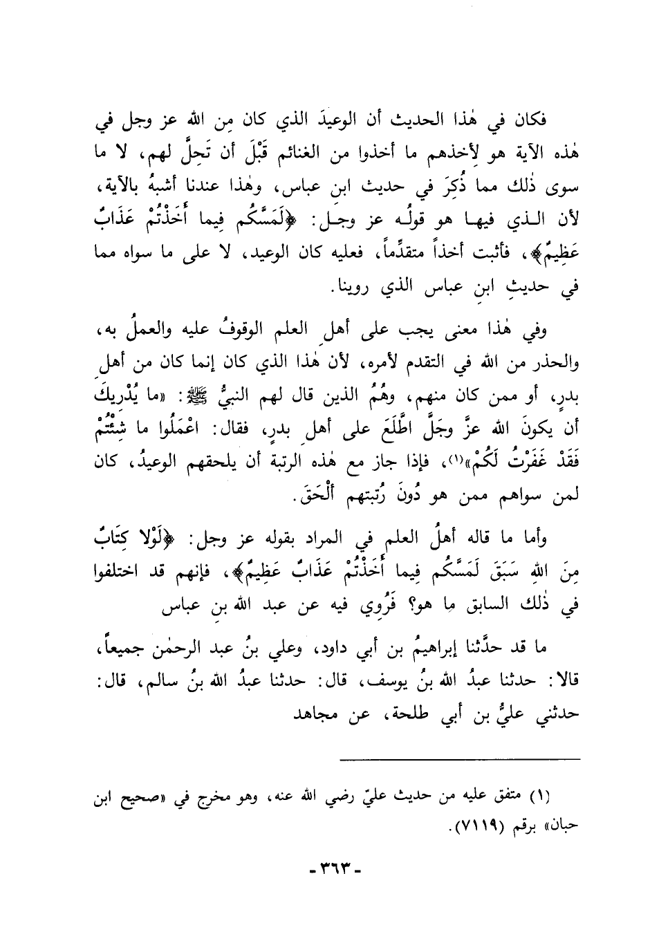 مَا قَدْ حَدَّثَنَا إبْرَاهِيمُ بْنُ أَبِي دَاوُدَ، وَعَلِيُّ بْنُ عَبْدِ الرَّحْمَنِ جَمِيعًا قَالَا: حَدَّثَنَا عَبْدُ اللهِ بْنُ يُوسُفَ قَالَ: حَدَّثَنَا عَبْدُ اللهِ بْنُ سَالِمٍ قَالَ: حَدَّثَنِي عَلِيُّ بْنُ أَبِي طَلْحَةَ، عَنْ مُجَاهِدٍ، -[364]- عَنِ ابْنِ عَبَّاسٍ: {لَوْلَا كِتَابٌ مِنَ اللهِ سَبَقَ لَمَسَّكُمْ فِيمَا أَخَذْتُمْ عَذَابٌ عَظِيمٌ} [الأنفال: 68] قَالَ: " سَبَقَتْ لَهُمْ مِنَ اللهِ عَزَّ وَجَلَّ الرَّحْمَةُ قَبْلَ أَنْ يَعْمَلُوا بِالْمَعْصِيَةِ ". قَالَ أَبُو جَعْفَرٍ: فَهَذَا وَجْهٌ مِمَّا قَدْ قِيلَ فِي ذَلِكَ. وَقَدْ قِيلَ فِيهِ وَجْهٌ آخَرُ وَهُوَ