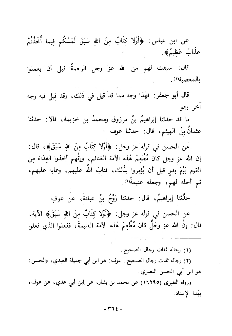 حَدَّثَنَا إبْرَاهِيمُ قَالَ: حَدَّثَنَا رَوْحُ بْنُ عُبَادَةَ، عَنْ عَوْفٍ، عَنِ الْحَسَنِ فِي قَوْلِهِ عَزَّ وَجَلَّ: {لَوْلَا كِتَابٌ مِنَ اللهِ سَبَقَ} [الأنفال: 68] الْآيَةَ، قَالَ: " إنَّ اللهَ عَزَّ وَجَلَّ كَانَ مُطْعِمَ هَذِهِ الْأُمَّةَ الْغَنِيمَةَ، فَفَعَلُوا الَّذِي فَعَلُوا -[365]- قَبْلَ أَنْ تَحِلَّ لَهُمُ الْغَنِيمَةُ ". حَدَّثَنَا أَحْمَدُ بْنُ دَاوُدَ قَالَ: حَدَّثَنَا مُسَدِّدٌ قَالَ: حَدَّثَنَا حُصَيْنُ بْنُ نُمَيْرٍ قَالَ: حَدَّثَنِي سُفْيَانُ بْنُ حُسَيْنِ، عَنِ الْحَكَمِ، عَنْ مُجَاهِدٍ فِي هَذِهِ الْآيَةِ قَالَ: " سَبَقَ أَنْ أَحَلَّ الْغَنَائِمَ لِهَذِهِ الْأُمَّةِ ". قَالَ: وَقَالَ الْحَسَنُ: " سَبَقَ مِنَ اللهِ عَزَّ وَجَلَّ أَنْ لَا يُعَذِّبَ قَوْمًا إلَّا بَعْدَ تَقَدُّمِهِ إلَيْهِمْ، وَلَمْ يَكُنْ تَقَدَّمَ إلَيْهِمْ فِيهَا ". وَقَدْ قِيلَ: فِيهِ وَجْهٌ آخَرُ، وَهُوَ