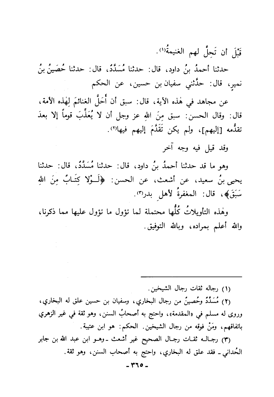 مَا قَدْ حَدَّثَنَا أَحْمَدُ بْنُ دَاوُدَ قَالَ: حَدَّثَنَا مُسَدِّدٌ قَالَ: حَدَّثَنَا يَحْيَى بْنُ سَعِيدٍ، عَنْ أَشْعَثَ، عَنِ الْحَسَنِ: {لَوْلَا كِتَابٌ مِنَ اللهِ سَبَقَ} [الأنفال: 68] قَالَ: " الْمَغْفِرَةُ لِأَهْلِ بَدْرٍ ". وَهَذِهِ التَّأْوِيلَاتُ كُلُّهَا مُحْتَمَلَةٌ لِمَا تُؤَوَّلُ مَا تُؤُوِّلَ عَلَيْهَا مِمَّا ذَكَرْنَا , وَاللهُ أَعْلَمُ بِمُرَادِهِ، وَبِاللهِ التَّوْفِيقُ.