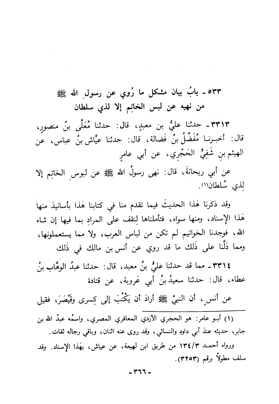 3313 - حَدَّثَنَا عَلِيُّ بْنُ مَعْبَدٍ قَالَ: حَدَّثَنَا مُعَلَّى بْنُ مَنْصُورٍ قَالَ: أَخْبَرَنَا مُفَضَّلُ بْنُ فَضَالَةَ قَالَ: حَدَّثَنَا عَيَّاشُ بْنِ عَبَّاسٍ، عَنِ الْهَيْثَمِ بْنِ شُفَيٍّ الْحَجْرِيِّ، عَنْ أَبِي عَامِرٍ، عَنْ أَبِي رَيْحَانَةَ قَالَ: " نَهَى رَسُولُ اللهِ صَلَّى اللَّهُ عَلَيْهِ وَسَلَّمَ عَنْ لُبُوسِ الْخَاتَمِ إلَّا لِذِي سُلْطَانٍ ". وَقَدْ ذَكَرْنَا هَذَا الْحَدِيثَ فِيمَا تَقَدَّمَ مِنَّا فِي كِتَابِنَا هَذَا بِأَسَانِيدَ مِنْهَا هَذَا الْإِسْنَادُ، وَمِنْهَا سِوَاهُ، فَتَأَمَّلْنَاهَا لِنَقِفَ عَلَى الْمُرَادِ بِمَا فِيهَا إنْ شَاءَ اللهُ، فَوَجَدْنَا الْخَوَاتِيمَ لَمْ تَكُنْ مِنْ لِبَاسِ الْعَرَبِ وَلَا مِمَّا يَسْتَعْمِلُونَهَا , وَمِمَّا دَلَّنَا عَلَى ذَلِكَ مَا قَدْ رُوِيَ عَنْ أَنَسِ بْنِ مَالِكٍ فِي ذَلِكَ.