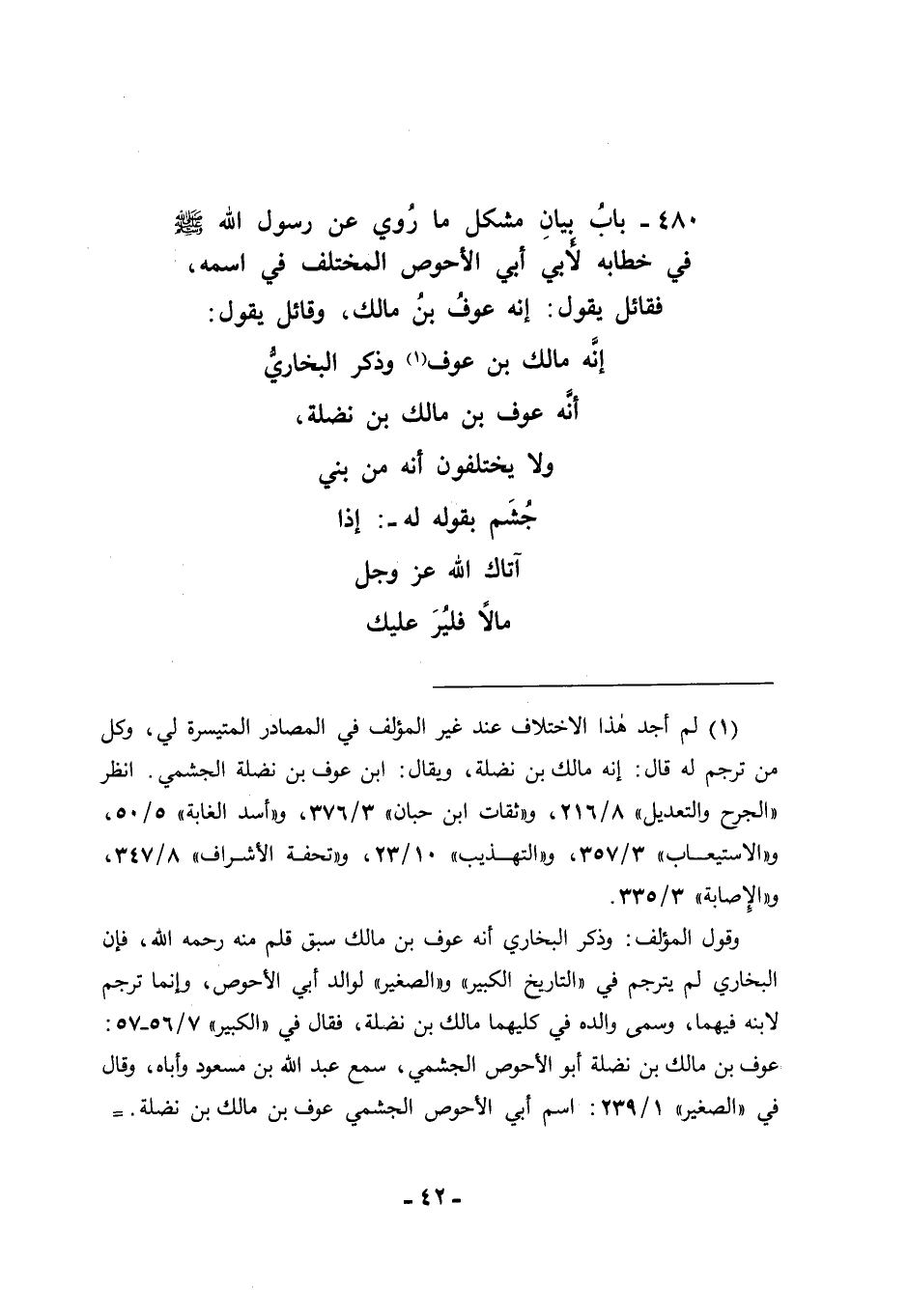 بَابُ بَيَانِ مُشْكِلِ مَا رُوِيَ عَنْ رَسُولِ اللهِ صَلَّى اللَّهُ عَلَيْهِ وَسَلَّمَ فِي خِطَابِهِ لِأَبِي أَبِي الْأَحْوَصِ الْمُخْتَلَفِ فِي اسْمِهِ فَقَائِلٌ يَقُولُ: إنَّهُ عَوْفُ بْنُ مَالِكٍ، وَقَائِلٌ يَقُولُ إنَّهُ مَالِكُ بْنُ عَوْفٍ، وَذَكَرَ الْبُخَارِيُّ أَنَّهُ عَوْفُ بْنُ مَالِكِ بْنِ نَضْلَةَ، وَلَا يَخْتَلِفُونَ أَنَّهُ مِنْ بَنِي جُشَمٍ، بِقَوْلِهِ لَهُ: " إذَا آتَاكَ اللهُ عَزَّ وَجَلَّ مَالًا فَلْيُرَ عَلَيْكَ "