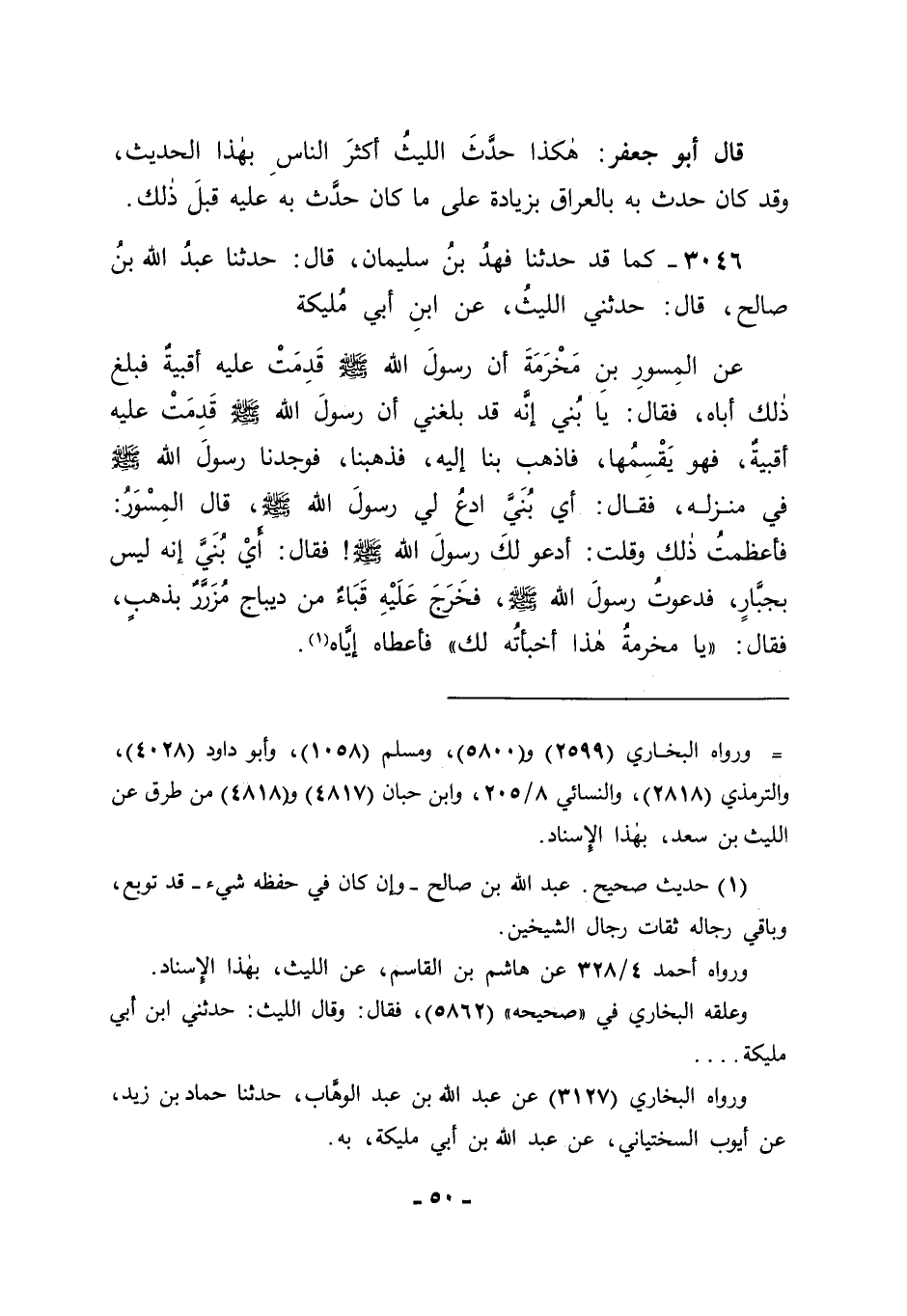 3046 - كَمَا قَدْ حَدَّثَنَا فَهْدُ بْنُ سُلَيْمَانَ قَالَ: حَدَّثَنَا عَبْدُ اللهِ بْنُ صَالِحٍ قَالَ: حَدَّثَنِي اللَّيْثُ، عَنِ ابْنِ أَبِي مُلَيْكَةَ، عَنِ الْمِسْوَرِ بْنِ مَخْرَمَةَ أَنَّ رَسُولَ اللهِ صَلَّى اللَّهُ عَلَيْهِ وَسَلَّمَ قَدِمَتْ عَلَيْهِ أَقْبِيَةٌ فَبَلَغَ ذَلِكَ أَبَاهُ فَقَالَ: يَا بُنَيَّ، إنَّهُ قَدْ بَلَغَنِي أَنَّ رَسُولَ اللهِ صَلَّى اللَّهُ عَلَيْهِ وَسَلَّمَ قَدِمَتْ عَلَيْهِ أَقْبِيَةٌ فَهُوَ يُقَسِّمُهَا، فَاذْهَبْ بِنَا إلَيْهِ، فَذَهَبْنَا فَوَجَدْنَا رَسُولَ اللهِ صَلَّى اللَّهُ عَلَيْهِ وَسَلَّمَ فِي مَنْزِلِهِ، فَقَالَ: أَيْ بُنَيَّ، ادْعُ لِي رَسُولَ اللهِ صَلَّى اللَّهُ عَلَيْهِ وَسَلَّمَ. قَالَ الْمِسْوَرُ: فَأَعْظَمْتُ ذَلِكَ وَقُلْتُ: أَدْعُو لَكَ رَسُولَ اللهِ صَلَّى اللَّهُ عَلَيْهِ وَسَلَّمَ فَقَالَ: " أَيْ بُنَيَّ، إنَّهُ لَيْسَ بِجَبَّارٍ " فَدَعَوْتُ رَسُولَ اللهِ صَلَّى اللَّهُ عَلَيْهِ وَسَلَّمَ فَخَرَجَ عَلَيْهِ قَبَاءٌ مِنْ دِيبَاجٍ مُزَرَّرٍ بِذَهَبٍ، فَقَالَ: " يَا مَخْرَمَةُ، هَذَا أَخْبَأْتُهُ لَكَ " فَأَعْطَاهُ إيَّاهُ. -[51]- قَالَ أَبُو جَعْفَرٍ: فَفِي هَذَا الْحَدِيثِ لُبْسُ رَسُولِ اللهِ صَلَّى اللَّهُ عَلَيْهِ وَسَلَّمَ لِذَلِكَ الْقَبَاءِ وَهُوَ مِنْ دِيبَاجٍ مُزَرَّرٍ بِذَهَبٍ، وَذَلِكَ قَبْلَ تَحْرِيمِ لُبْسِ الْحَرِيرِ، وَسَنَذْكُرُ مَا رُوِيَ فِي إبَاحَةِ لُبْسِ الْحَرِيرِ، وَمَا رُوِيَ فِي نَسْخِ ذَلِكَ وَتَحْرِيمِهِ فِيمَا بَعْدُ مِنْ كِتَابِنَا هَذَا إنْ شَاءَ اللهُ.
