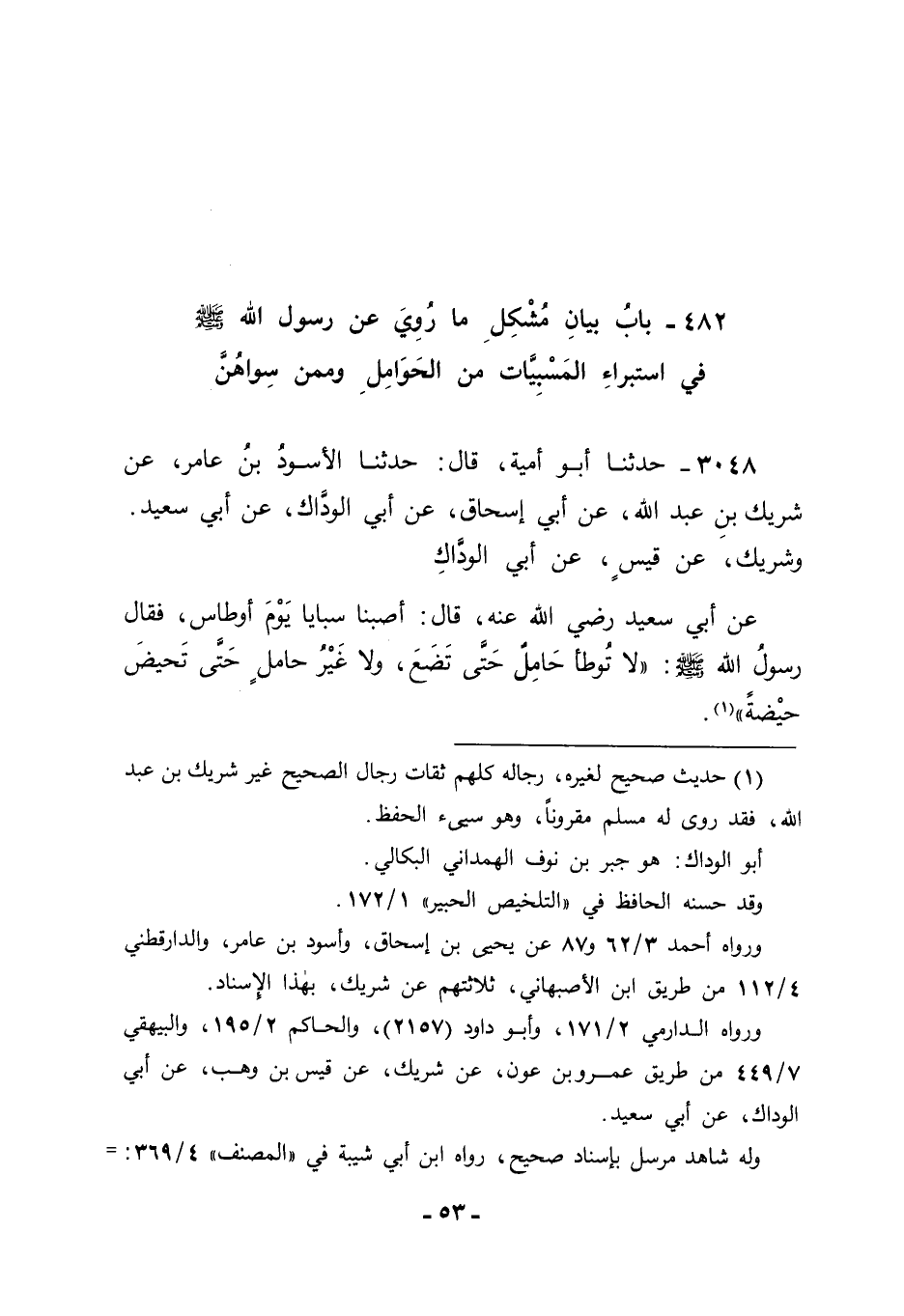 3048 - حَدَّثَنَا أَبُو أُمَيَّةَ قَالَ: حَدَّثَنَا الْأَسْوَدُ بْنُ عَامِرٍ، عَنْ شَرِيكِ بْنِ عَبْدِ اللهِ، عَنْ أَبِي إِسْحَاقَ، عَنْ أَبِي الْوَدَّاكِ، عَنْ أَبِي سَعِيدٍ، وَشَرِيكٍ، عَنْ قَيْسٍ، عَنْ أَبِي الْوَدَّاكِ، عَنْ أَبِي سَعِيدٍ رَضِيَ اللهُ عَنْهُ قَالَ: أَصَبْنَا سَبَايَا يَوْمَ أَوْطَاسٍ، فَقَالَ رَسُولُ اللهِ صَلَّى اللَّهُ عَلَيْهِ وَسَلَّمَ: " لَا تُوطَأُ حَامِلٌ حَتَّى تَضَعَ، وَلَا غَيْرُ حَامِلٍ حَتَّى تَحِيضَ حَيْضَةً ". -[55]-