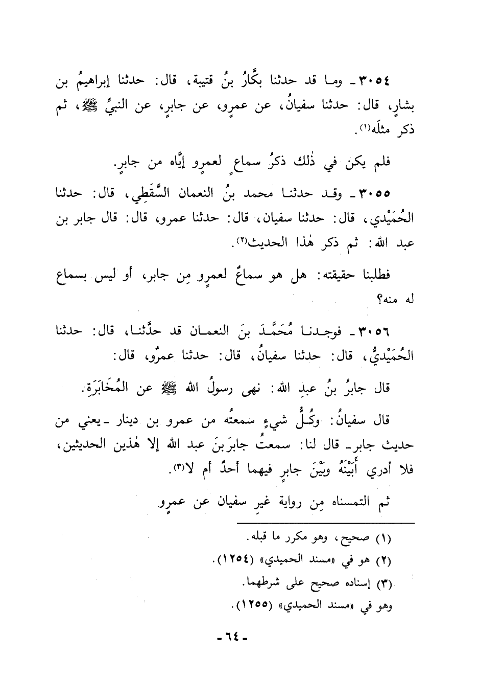 3056 - فَوَجَدْنَا مُحَمَّدَ بْنَ النُّعْمَانِ قَدْ حَدَّثَنَا قَالَ: حَدَّثَنَا الْحُمَيْدِيُّ قَالَ: حَدَّثَنَا سُفْيَانُ قَالَ: حَدَّثَنَا عَمْرٌو قَالَ: قَالَ جَابِرُ بْنُ عَبْدِ اللهِ: " نَهَى رَسُولُ اللهِ صَلَّى اللَّهُ عَلَيْهِ وَسَلَّمَ عَنِ الْمُخَابَرَةِ ". قَالَ سُفْيَانُ: وَكُلُّ شَيْءٍ سَمِعْتُهُ مِنْ عَمْرِو بْنِ دِينَارٍ، يَعْنِي مِنْ حَدِيثِ جَابِرٍ قَالَ لَنَا: سَمِعْتُ جَابِرَ بْنَ عَبْدِ اللهِ إِلَّا هَذَيْنِ الْحَدِيثَيْنِ، فَلَا أَدْرِي أَبَيْنَهُ وَبَيْنَ جَابِرٍ فِيهِمَا أَحَدٌ أَمْ لَا. ثُمَّ الْتَمَسْنَاهُ مِنْ رِوَايَةِ غَيْرِ سُفْيَانَ عَنْ عَمْرٍو -[65]-