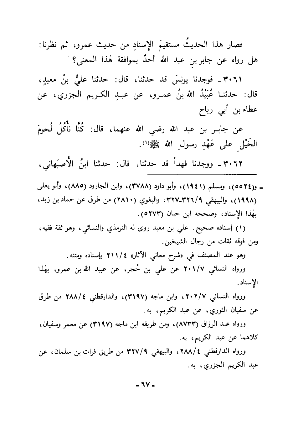 3062 - وَوَجَدْنَا فَهْدًا قَدْ حَدَّثَنَا قَالَ: حَدَّثَنَا ابْنُ الْأَصْبَهَانِيِّ -[68]- قَالَ: أَنْبَأَنَا شَرِيكٌ، عَنْ عَبْدِ الْكَرِيمِ، وَوَكِيعٌ، عَنْ سُفْيَانَ، عَنْ عَبْدِ الْكَرِيمِ، ثُمَّ ذَكَرَ مِثْلَهُ. فَاتَّفَقَ مُحَمَّدُ بْنُ عَلِيِّ بْنِ حُسَيْنٍ، وَعَطَاءٌ عَنْ جَابِرِ بْنِ عَبْدِ اللهِ فِي إبَاحَةِ لُحُومِ الْخَيْلِ