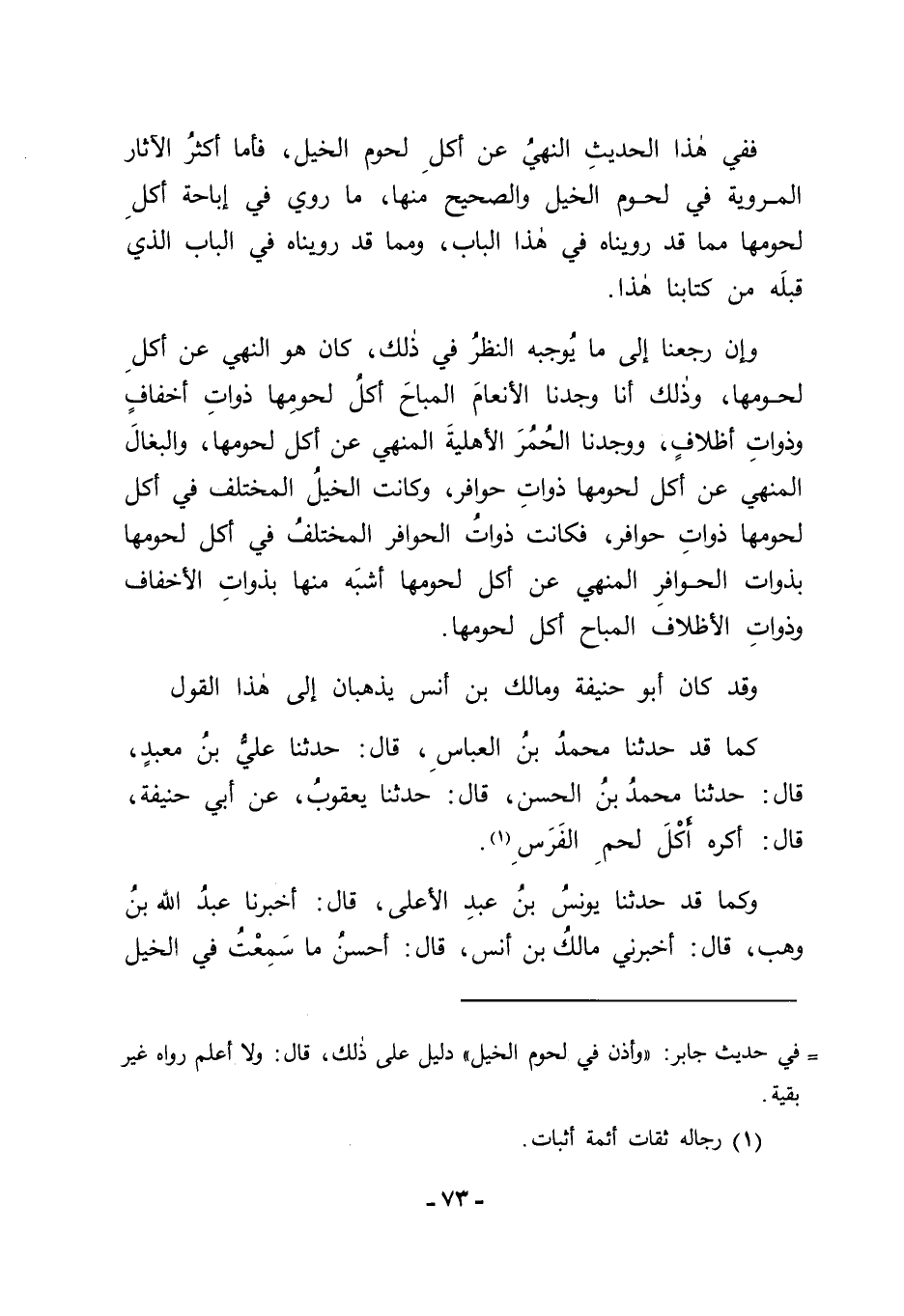 وَكَمَا قَدْ حَدَّثَنَا يُونُسُ بْنُ عَبْدِ الْأَعْلَى قَالَ: أَخْبَرَنَا عَبْدُ اللهِ بْنُ وَهْبٍ قَالَ: أَخْبَرَنِي مَالِكُ بْنُ أَنَسٍ قَالَ: " أَحْسَنُ مَا سَمِعْتُ فِي الْخَيْلِ -[74]- وَالْبِغَالِ وَالْحَمِيرِ أَنَّهَا لَا تُؤْكَلُ ; لِأَنَّ اللهَ عَزَّ وَجَلَّ قَالَ: {وَالْخَيْلَ وَالْبِغَالَ وَالْحَمِيرَ لِتَرْكَبُوهَا وَزِينَةً} [النحل: 8] ، وَقَالَ تَبَارَكَ وَتَعَالَى فِي الْأَنْعَامِ: {لِتَرْكَبُوا مِنْهَا وَمِنْهَا تَأْكُلُونَ} [غافر: 79] ، وَقَالَ: تَبَارَكَ وَتَعَالَى: {وَيَذْكُرُوا اسْمَ اللهِ فِي أَيَّامٍ مَعْلُومَاتٍ عَلَى مَا رَزَقَهُمْ مِنْ بَهِيمَةِ الْأَنْعَامِ، فَكُلُوا مِنْهَا وَأَطْعِمُوا الْبَائِسَ الْفَقِيرَ} [الحج: 28] . قَالَ مَالِكٌ: فَذَكَرَ اللهُ عَزَّ وَجَلَّ الْخَيْلَ، وَالْبِغَالَ، وَالْحَمِيرَ لِلرُّكُوبِ وَالزِّينَةِ، وَذَكَرَ الْأَنْعَامَ لِلرُّكُوبِ وَالْأَكْلِ مِنْهَا. قَالَ مَالِكٌ: وَذَلِكَ الْأَمْرُ عِنْدَنَا ". -[75]- فَأَمَّا أَبُو يُوسُفَ، وَمُحَمَّدُ بْنُ الْحَسَنِ فَكَانَا يَذْهَبَانِ فِي ذَلِكَ إلَى إبَاحَةِ أَكْلِ لُحُومِهَا. كَمَا قَدْ حَدَّثَنَا مُحَمَّدُ بْنُ الْعَبَّاسِ قَالَ: حَدَّثَنَا عَلِيٌّ قَالَ: حَدَّثَنَا مُحَمَّدٌ فَذَكَرَ مَا قَدْ حَكَيْنَاهُ عَنْهُ أَيْضًا. فَتَأَمَّلْنَا مَا حُكِيَ عَنْ مَالِكٍ مِمَّا احْتَجَّ بِهِ فِي كَرَاهِيَةِ لُحُومِ الْخَيْلِ مِنْ أَنَّ اللهَ عَزَّ وَجَلَّ إنَّمَا خَلَقَهَا لِلرُّكُوبِ وَالزِّينَةِ، هَلْ ذَلِكَ مِمَّا يَمْنَعُ أَكْلَ لُحُومِهَا أَمْ لَا؟ فَوَجَدْنَا اللهَ عَزَّ وَجَلَّ قَدْ قَالَ فِي كِتَابِهِ: {وَلَا يَزَالُونَ مُخْتَلِفِينَ} [هود: 118] {إِلَّا مَنْ رَحِمَ رَبُّكَ، وَلِذَلِكَ خَلَقَهُمْ} [هود: 119] . فَلَمْ يَكُنْ ذَلِكَ مَانِعًا مِنْ أَنْ يَكُونَ أَيْضًا قَدْ خَلَقَهُمْ لِغَيْرِ ذَلِكَ، إذْ كَانَ اللهُ عَزَّ وَجَلَّ قَدْ قَالَ: {وَمَا خَلَقْتُ الْجِنَّ وَالْإِنْسَ إِلَّا لِيَعْبُدُونِ} [الذاريات: 56] . فَعَقِلْنَا بِذَلِكَ أَنَّهُمْ مَخْلُوقُونَ لِمَا ذَكَرَ خَلْقَهُ إيَّاهُمْ فِي كُلِّ وَاحِدَةٍ مِنْ هَاتَيْنِ الْآيَتَيْنِ، وَلَمَّا كَانَ ذَلِكَ كَذَلِكَ كَانَ مِثْلَهُ قَوْلُهُ جَلَّ وَعَزَّ: {وَالْخَيْلَ وَالْبِغَالَ وَالْحَمِيرَ لِتَرْكَبُوهَا وَزِينَةً} [النحل: 8] لَا يَمْنَعُ أَنْ يَكُونَ خَلَقَهَا لِذَلِكَ وَلِمَا سِوَاهُ مِمَّا أَبَاحَهُ مِنْ أَفْعَالِ رَسُولِ اللهِ صَلَّى اللَّهُ عَلَيْهِ وَسَلَّمَ مِنْ إطْعَامِهِ النَّاسَ لُحُومَهَا. وَمِثْلُ ذَلِكَ مَا قَدْ وَجَدْنَاهُ فِي سُنَّةِ رَسُولِ اللهِ صَلَّى اللَّهُ عَلَيْهِ وَسَلَّمَ مِمَّا يَدُلُّ عَلَى هَذَا الْمَعْنَى أَيْضًا.
