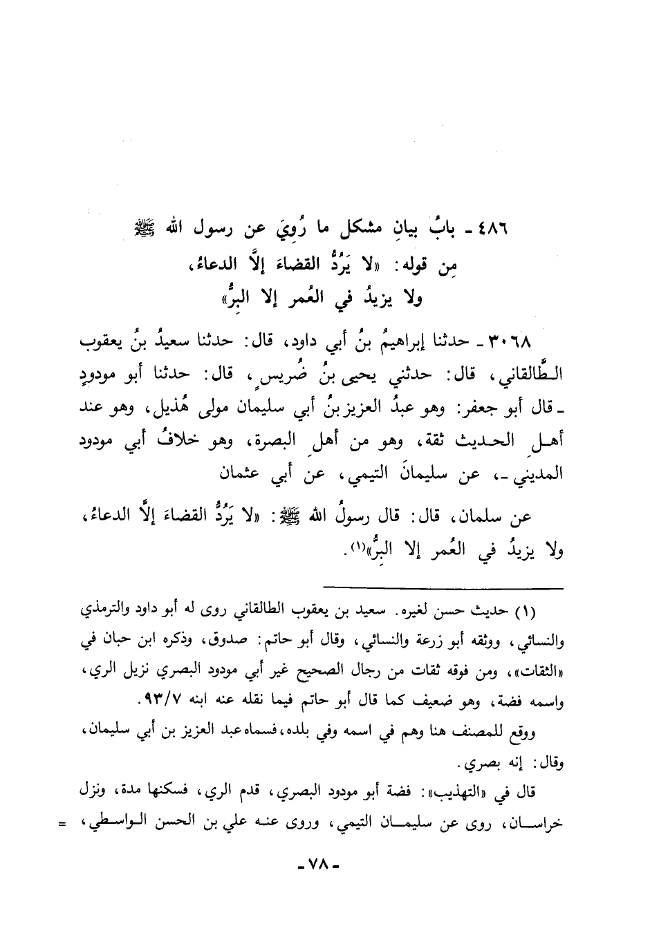 3068 - حَدَّثَنَا إبْرَاهِيمُ بْنُ أَبِي دَاوُدَ قَالَ: حَدَّثَنَا سَعِيدُ بْنُ يَعْقُوبَ الطَّالَقَانِيُّ قَالَ: حَدَّثَنِي يَحْيَى بْنُ ضَرِيسٍ قَالَ: حَدَّثَنَا أَبُو مَوْدُودٍ. قَالَ: أَبُو جَعْفَرٍ: وَهُوَ عَبْدُ الْعَزِيزِ بْنُ أَبِي سُلَيْمَانَ مَوْلَى هُذَيْلٍ، وَهُوَ عِنْدَ أَهْلِ الْحَدِيثِ ثِقَةٌ، وَهُوَ مِنْ أَهْلِ الْبَصْرَةِ، وَهُوَ خِلَافُ أَبِي مَوْدُودٍ الْمَدِينِيِّ. عَنْ سُلَيْمَانَ التَّيْمِيِّ، عَنْ أَبِي عُثْمَانَ، عَنْ سَلْمَانَ قَالَ: قَالَ رَسُولُ اللهِ صَلَّى اللَّهُ عَلَيْهِ وَسَلَّمَ: " لَا يَرُدُّ الْقَضَاءَ إِلَّا الدُّعَاءُ، وَلَا يَزِيدُ فِي الْعُمُرِ إِلَّا الْبِرُّ "