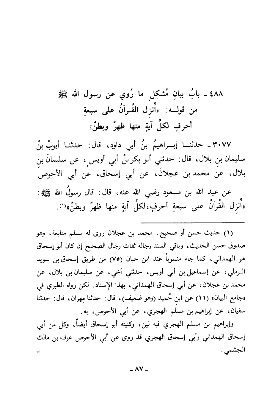 3077 - حَدَّثَنَا إبْرَاهِيمُ بْنُ أَبِي دَاوُدَ قَالَ: حَدَّثَنَا أَيُّوبُ بْنُ سُلَيْمَانَ بْنِ بِلَالٍ قَالَ: حَدَّثَنِي أَبُو بَكْرِ بْنُ أَبِي أُوَيْسٍ، عَنْ سُلَيْمَانَ بْنِ بِلَالٍ، عَنْ مُحَمَّدِ بْنِ عَجْلَانَ، عَنْ أَبِي إِسْحَاقَ، عَنْ أَبِي الْأَحْوَصِ، عَنْ عَبْدِ اللهِ بْنِ مَسْعُودٍ رَضِيَ اللهُ عَنْهُ قَالَ: قَالَ رَسُولُ اللهِ صَلَّى اللَّهُ عَلَيْهِ وَسَلَّمَ: " أُنْزِلَ الْقُرْآنُ عَلَى سَبْعَةِ أَحْرُفٍ، لِكُلِّ آيَةٍ مِنْهَا ظَهْرٌ وَبَطْنٌ ". -[88]- قَالَ أَبُو جَعْفَرٍ: فَتَأَمَّلْنَا هَذَا الْحَدِيثَ فَكَانَ أَحْسَنَ مَا جَاءَ فِيهِ مِنَ التَّأْوِيلِ الَّذِي يَحْتَمِلُهُ أَنْ يَكُونَ الظَّهْرُ مِنْهَا هُوَ مَا يَظْهَرُ مِنْ مَعْنَاهَا، وَالْبَطْنُ مِنْهَا هُوَ مَا يُبْطَنُ مِنْ مَعْنَاهَا، وَدَلَّ ذَلِكَ عَلَى أَنَّ عَلَى النَّاسِ -[89]- طَلَبَ بَاطِنِهَا، كَمَا عَلَيْهِمْ طَلَبُ ظَاهِرِهَا، لِيَقِفُوا عَلَى مَا فِي كُلِّ وَاحِدٍ مِنْهُمَا مِمَّا تَعَبَّدَهُمُ اللهُ بِهِ، وَمَا فِيهِ مِنْ حَلَالٍ وَمِنْ حَرَامٍ، وَاللهَ نَسْأَلُهُ التَّوْفِيقَ.