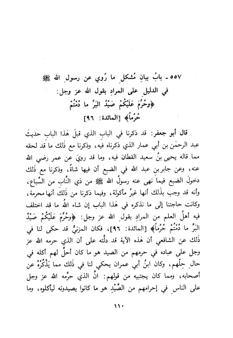 بَابُ بَيَانِ مُشْكِلِ مَا رُوِيَ عَنْ رَسُولِ اللهِ صَلَّى اللَّهُ عَلَيْهِ وَسَلَّمَ فِي الدَّلِيلِ عَلَى الْمُرَادِ بِقَوْلِ اللهِ عَزَّ وَجَلَّ: {وَحُرِّمَ عَلَيْكُمْ صَيْدُ الْبَرِّ مَا دُمْتُمْ حُرُمًا} [المائدة: 96] قَالَ أَبُو جَعْفَرٍ: قَدْ ذَكَرْنَا فِي الْبَابِ الَّذِي قَبْلَ هَذَا الْبَابِ حَدِيثَ عَبْدِ الرَّحْمَنِ بْنِ أَبِي عَمَّارٍ الَّذِي ذَكَرْنَاهُ فِيهِ , وَذَكَرْنَا مَعَ ذَلِكَ مَا قَدْ لَحِقَهُ مِمَّا قَالَهُ يَحْيَى بْنُ سَعِيدٍ الْقَطَّانُ فِيهِ , وَمَا قَدْ رُوِيَ عَنْ عُمَرَ رَضِيَ اللهُ عَنْهُ , وَعَنْ جَابِرِ بْنِ عَبْدِ اللهِ فِي الضَّبُعِ: " أَنَّ فِيهَا شَاةً ". وَذَكَرْنَا مَعَ ذَلِكَ دُخُولَ الضَّبُعِ فِيمَا نَهَى عَنْهُ رَسُولُ اللهِ صَلَّى اللَّهُ عَلَيْهِ وَسَلَّمَ مِنْ ذِي النَّابِ مِنَ السِّبَاعِ , وَأَنَّهُ قَدْ وَجَبَ بِذَلِكَ أَنَّهَا غَيْرُ مَأْكُولَةٍ , وَفِيمَا ذَكَرْنَا مِنْ ذَلِكَ أَنَّهَا مُحَرَّمَةٌ , وَكَانَتْ حَاجَتُنَا إِلَى مَا نَذْكُرُهُ فِي هَذَا الْبَابِ إِنْ شَاءَ اللهُ مَا قَدِ اخْتَلَفَ فِيهِ أَهْلُ الْعِلْمِ مِنَ الْمُرَادِ بِقَوْلِ اللهِ عَزَّ وَجَلَّ: {وَحُرِّمَ عَلَيْكُمْ صَيْدُ الْبَرِّ مَا دُمْتُمْ حُرُمًا} [المائدة: 96] , فَكَانَ الْمُزَنِيُّ قَدْ حَكَى لَنَا فِي ذَلِكَ عَنِ الشَّافِعِيِّ أَنَّ هَذِهِ الْآيَةَ قَدْ دَلَّتْهُ عَلَى أَنَّ الَّذِي حَرَّمَهُ اللهُ عَزَّ وَجَلَّ عَلَى عِبَادِهِ فِي حُرُمِهِمْ مِنَ الصَّيْدِ هُوَ مَا كَانَ أُحِلَّ لَهُمْ أَكْلُهُ فِي حَالِ حِلِّهِمْ. وَكَانَ ابْنُ أَبِي عِمْرَانَ يَحْكِي لَنَا فِي ذَلِكَ مِمَّا يَذْكُرُهُ عَنْ أَصْحَابِهِ , وَمِمَّا كَانَ يَجْتَبِيهِ مِنْ قَوْلِهِمْ: إِنَّ الَّذِي حَرَّمَهُ اللهُ عَزَّ وَجَلَّ عَلَى النَّاسِ فِي إِحْرَامِهِمْ مِنَ الصَّيْدِ هُوَ مَا كَانُوا يَصِيدُونَهُ لِيَأْكُلُوهُ , وَمَا